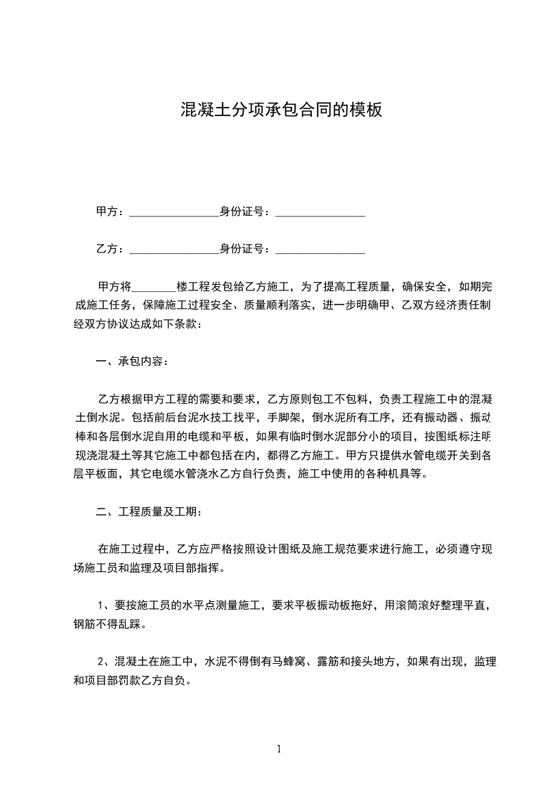乙方根据甲方工程的需要和要求,乙方原则包工不包料,负责工程施工中的混凝土倒水泥。包括前后台泥水技工找平,手脚架,倒水泥所有工序,还有振动器、振动棒和各层倒水泥自用的电缆和平板,如果有临时倒水泥部分小的项目,按图纸标注明现浇混凝土等其它施工中都包括在内,都得乙方施工。甲方只提供水管电缆开关到各层平板面,其它电缆水管浇水乙方自行负责,施工中使用的各种机具等。