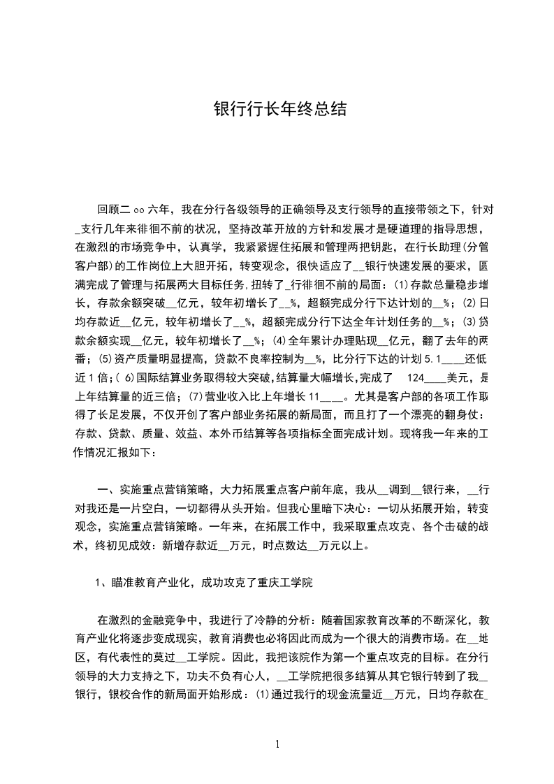 银行行长年底总结年我行认真贯彻执行分行个金经营方针,全行个金员工的商业银行经营理念有所提高,面对县城经济不发达的情况,在分行的正确领导下,经过全行个金员工的艰苦努力,个人经营业务成绩显著。