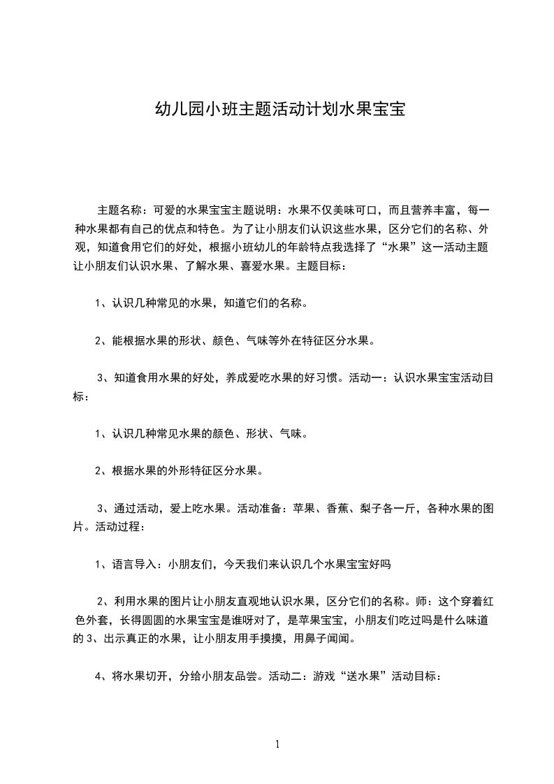 主题名称:可爱的水果宝宝主题说明:水果不仅美味可口,而且营养丰富,每一种水果都有自己的优点和特色。为了让小朋友们认识这些水果,区分它们的名称、外观,知道食用它们的好处,根据小班幼儿的年龄特点我选择了“水果”这一活动主题,让小朋友们认识水果、了解水果、喜爱水果。主题目标: