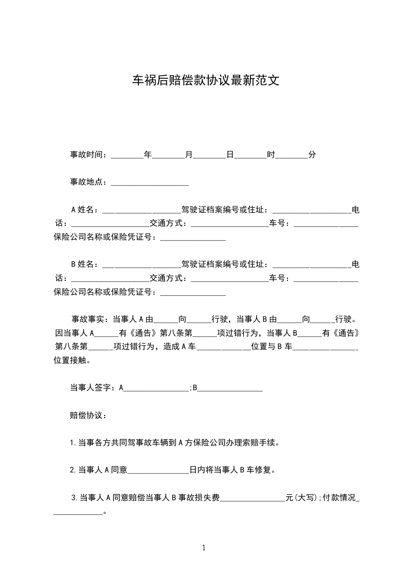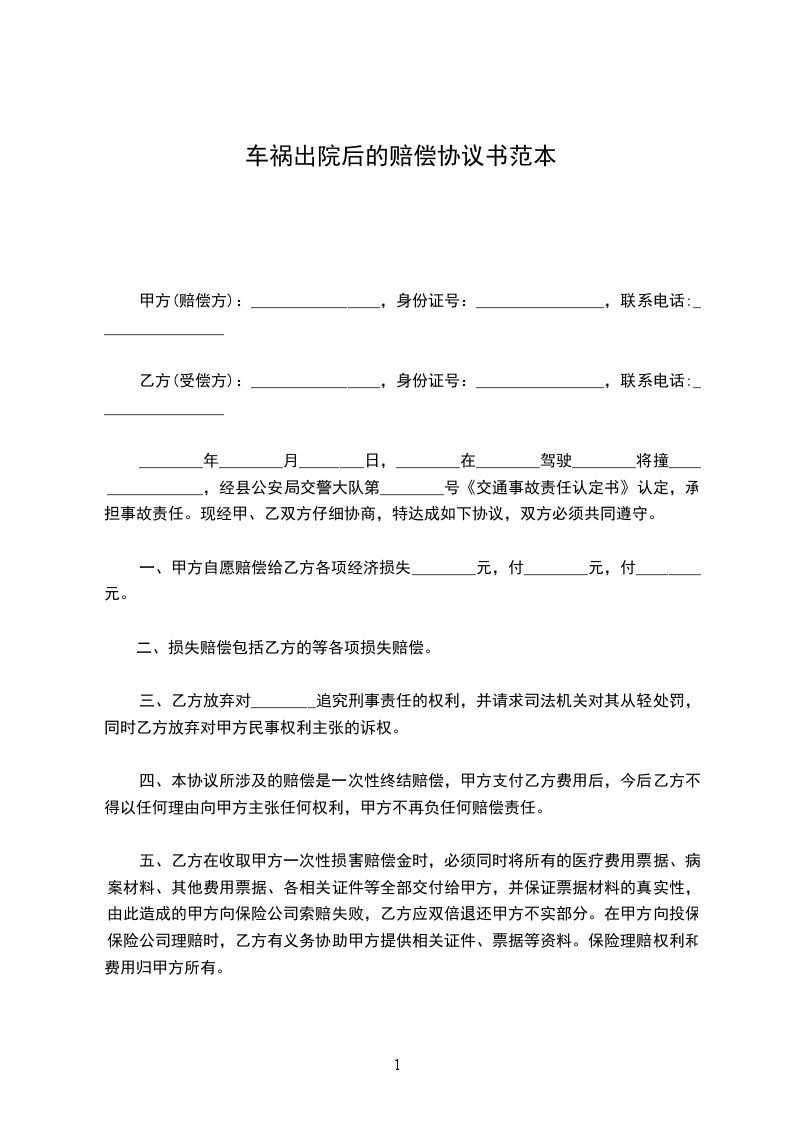 2.甲方应在本协议生效之日向乙方支付赔偿金____________元,其中交警大队保证金代为转付____________元,剩余款项____________元,甲方现金支付交警队,乙方出具收条,支付上述金额后乙方不得在提出任何请求。