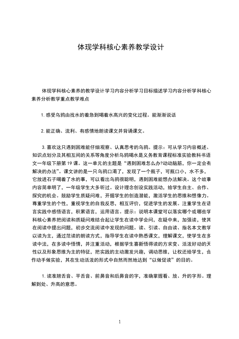 3.喜欢这只遇到困难能仔细观察、认真思考的乌鸦。提示:可从学习内容概述、知识点划分及其相互间的关系等角度分析乌鸦喝水是义务教育课程标准实验教科书语文一年级下册第19课。这一单元的主题是“遇到困难怎么办?动动脑筋,你一定会有解决的办法”。课文讲的是一只乌鸦口渴了,发现了一个瓶子,可瓶口小,水不多,它放进石子喝着了水的事,可以看出乌鸦很聪明,遇到困难能想办法解决。这个故事内容简单明了,一年级学生大多听过。设计理念创设实践活动,给学生自主、合作、探究的机会。鼓励学生质疑问难,开掘学生的创造潜能,激活学生的思维和想像力。尊重学生的个性,重视学生的自我反思,相互评价,促进学生的发展。注重学生在语言实践中感悟语言,积累语言,运用语言。提示:说明本课堂可以落实哪个或哪些学科核心素养把阅读和质疑问难结合起让学生在读中学会问,在疑中来,加强读,使其在阅读中提出问题,初步交流阅读中发现的问题。读、引读、自由读、指名本文教学以读为主,通过范读的朗读方式,指导学生在读中熟悉课文,理解课文,使学生在多读中法,在多读中悟情,并注重活动,根据学生喜新悟得读的方求变、活泼好动的天性以及形象思维为主的特征,把实践的主动激发兴趣,调动思维,让权还给学生,合作动手做实验,其在生动活泼的形式中自然而然地达到“以做促读”的目的。