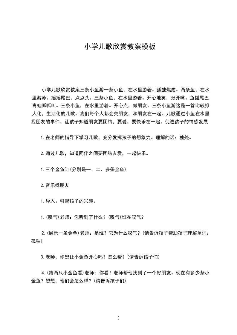 小学儿歌欣赏教案三条小鱼游一条小鱼,在水里游着。孤独焦虑。两条鱼,在水里游泳。摇摇尾巴,点点头。三条小鱼,在水里游着。开心地笑,张开嘴。鱼摇尾巴,青蛙呱呱叫。三条小鱼,在水里游着。开心点,做朋友。三条小鱼游这是一首比较拟人化,生活化的儿歌。我们每个人都会交朋友,和朋友在一起。儿歌通过小鱼在水里找朋友的事件,让孩子知道朋友要团结,要爱,要快乐在一起。促进孩子的情感发展。