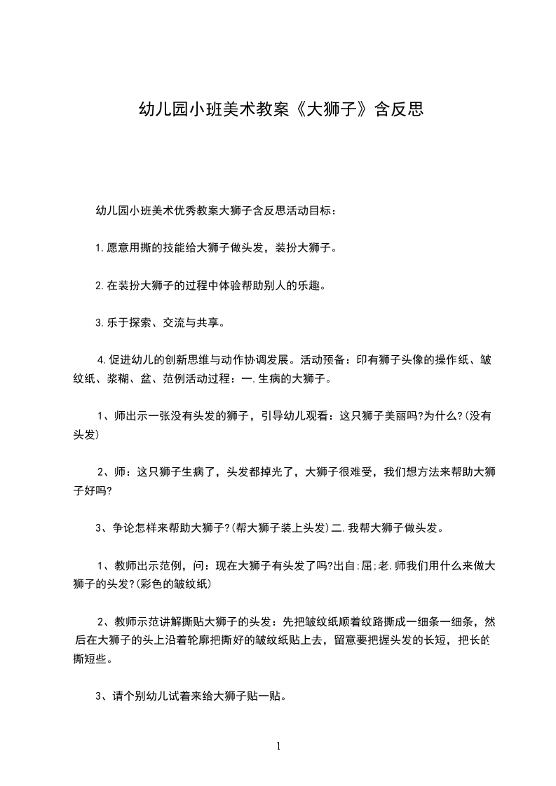 4.促进幼儿的创新思维与动作协调发展。活动预备:印有狮子头像的操作纸、皱纹纸、浆糊、盆、范例活动过程:一.生病的大狮子。