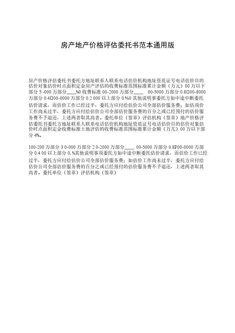 房产价格评估委托书委托方地址联系人联系电话估价机构地址资质证号电话估价目的估价对象估价时点面积定金房产评估的收费标准范围标准累计金额(万元)00万以下部分5 -000万部分____%0收费标准00-2000万部分____00-5000万部分0.800-8000万部分0.400-0000万部分0.2 000以上部分0.%0其他说明事委托方如中途中断委托估价请求,而估价工作已经过半,委托方应付给估价公司全部估价服务费;如估项价工作尚未过半,委托方应付给估价公司全部估价服务费的百分之或已经预付的估价服务费不予退还,上述两者取其高者。委托单位(签章)评估机构(签章)地产价格评估委托书委托方地址联系人联系电话估价机构地址资质证号电话估价目的估价对象估价时点面积定金收费标准土地评估的收费标准范围标准累计金额(万兀)00万以下部分4%。
