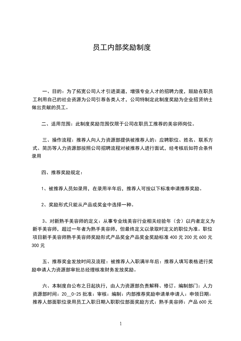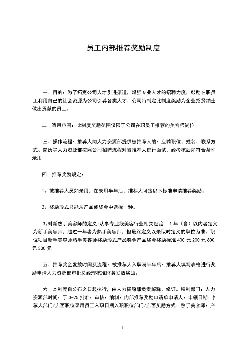 六、本制度自公布之日起执行,由人力资源部负责解释、修订。编制部门:人力资源部时间:20__0-25批准:审核:编制:内部推荐奖励申请单申请人:申领日期:推荐人部面职位录用员工入职日期入职职位部面奖励方式:熟手美容师:产品600元奖金300元新手美容师:产品400元奖金200元人力资源中心签批:签名:日期:总经理签批:签名:日期:内部推荐奖励申请单申请人:申领日期:推荐人部面职位录用员工入职日期入职职位部面奖励方式:熟手美容师:产品600元奖金300元新手美容师:产品400元奖金200元人力资源中心签批:签名:日期:总经理签批:签名:日期: