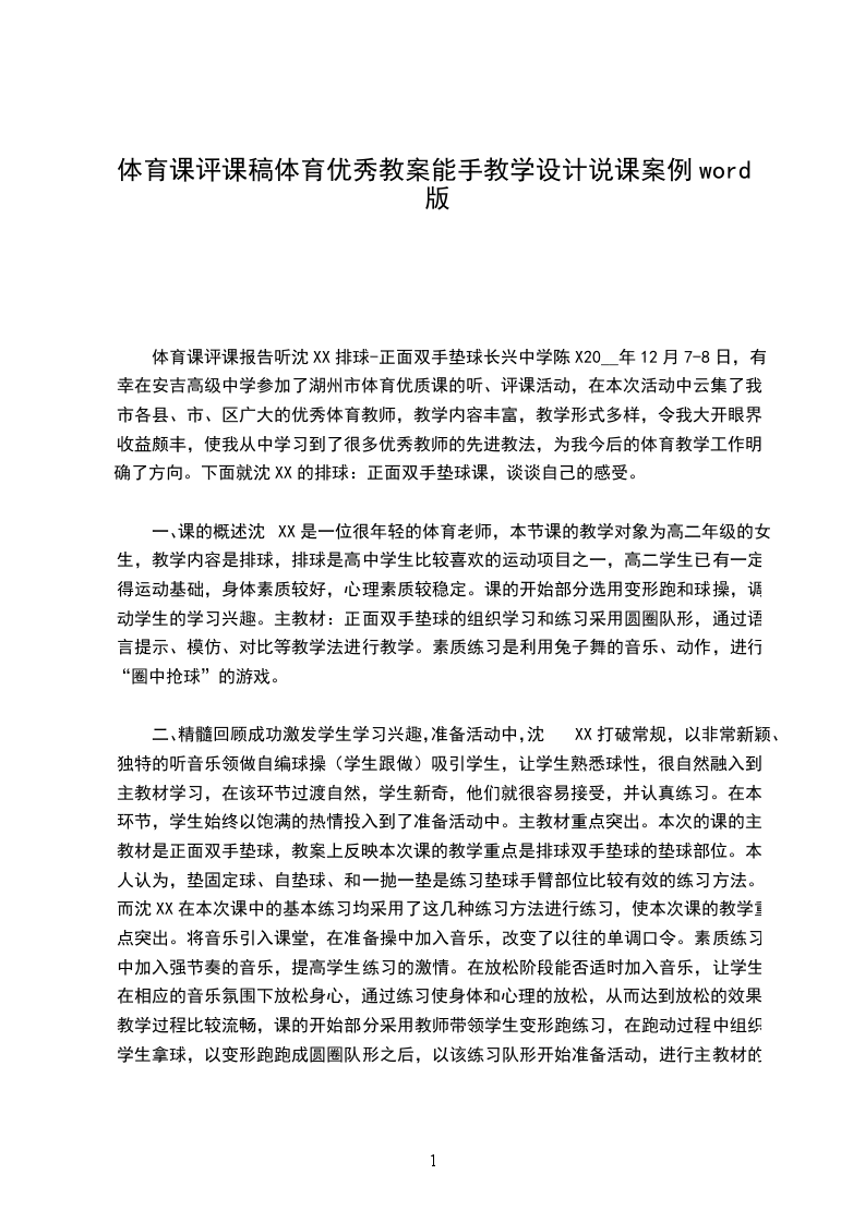 体育课评课报告听沈XX排球-正面双手垫球长兴中学陈X20__年12月7-8日,有幸在安吉高级中学参加了湖州市体育优质课的听、评课活动,在本次活动中云集了我市各县、市、区广大的优秀体育教师,教学内容丰富,教学形式多样,令我大开眼界,收益颇丰,使我从中学习到了很多优秀教师的先进教法,为我今后的体育教学工作明确了方向。下面就沈XX的排球:正面双手垫球课,谈谈自己的感受。