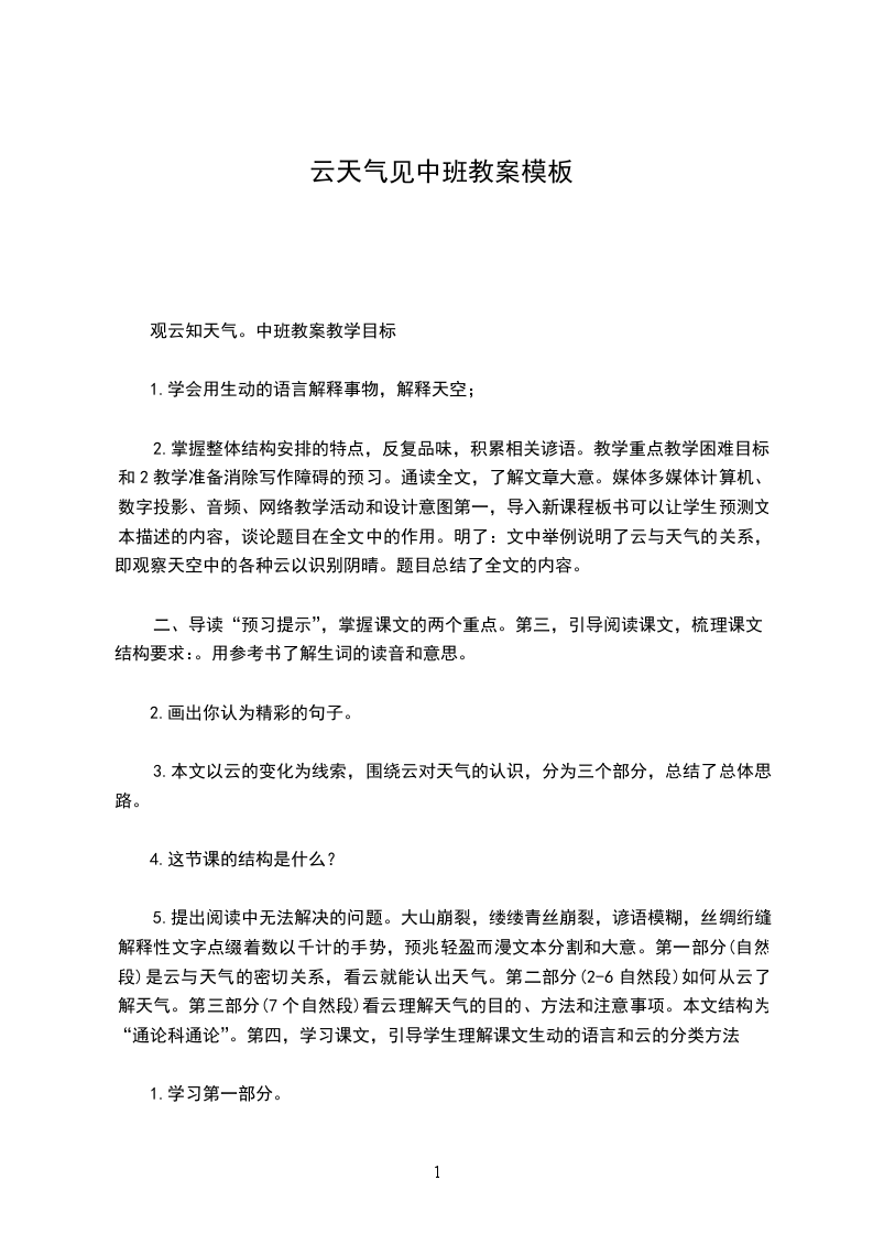 (1)云亮度与天气的关系。利用电视、网络和阅读材料收集关于天气的谚语,在课堂上进行交流。教学自我评价:自我评价指标自我评价等级公元前目标能体现新的教学理念(“三维”),学生有很高的成就。准确把握课程类型,合理设计内容(突出重点,突破难点)。课堂结构清晰严谨有节奏,教师主导作用明显。媒体使用及时恰当,效果显著。学生参与度高,氛围活跃,师生互动。得失启示观云知天气。中班教案二一,教学目标快速阅读课文,总结课文要点。理清张X的思路。理解隐喻之美。培养学生观察自然的兴趣和关注自然现象的习惯。二,教学重点把握文本的主要内容,理清写作思路,体会运用隐喻的妙处。第三,课前准备学生收集关于云和天气的谚语、关于云的习语、诗歌、文章片段等。并解决课文中的生词。