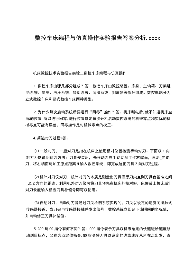5.数控车床日常使用维护项目。答:数控车床具有机、电、液集于一身的,技术密集和知识密集的特点,是一种自动化程度高、结构复杂且又昂贵的先进加工设备。为了充分发挥其效益,减少故障的发生,必须做好日常维护工作,所以要求数控车床维护人员不仅要有机械、加工工艺以及液压气动方面的知识,也要具备电子计算机、自动控制、驱动及测量技术等知识,这样才能全面了解、掌握数控车床,及时搞好维护工作。实验六:数控铣床结构与传动认识实验