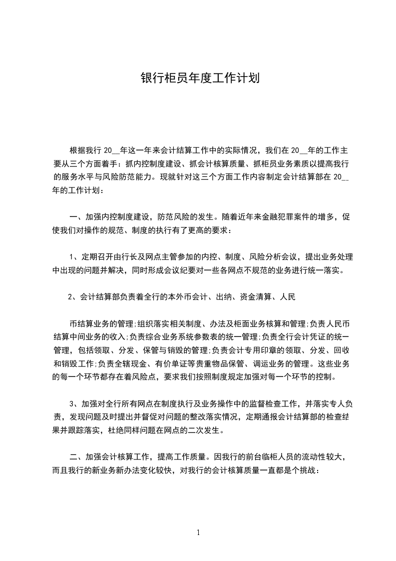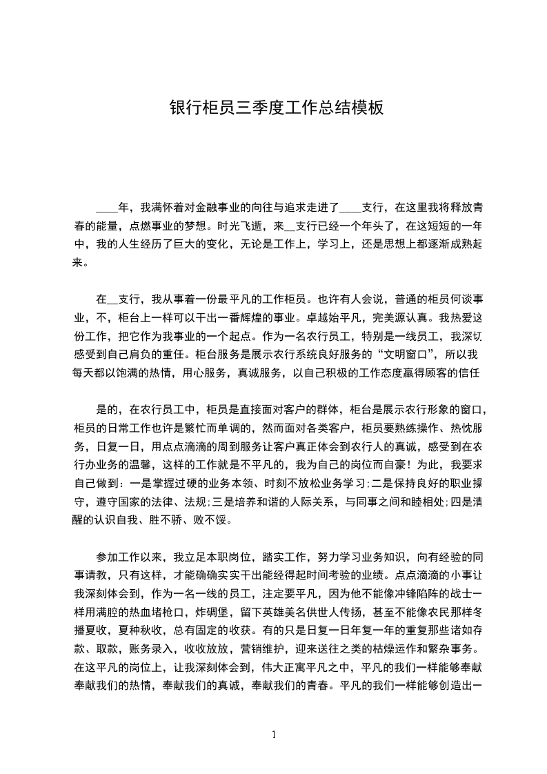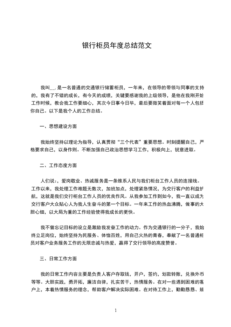 _年银行柜员年度工作总结模板当日历一页页撕落得只剩下最后一页,一年就这样不知不觉,悄无声息地度过。这一年里,我们用计算机键盘绘出了满天霞光,用算盘珠拔落了万颗星辰;我们守着一份愉悦,一份执着,一份收获。每天记账,结账,做传票,写账簿。虽然没有赫赫显目的业绩和惊天动地的事业,但我们尽心尽力,忠于职守。我们用这平平淡淡的生活,平平淡淡的工作勾画出生活的轨迹,收获着丰收的喜悦。这一年里,我始终保持着良好的工作状态,以一名合格的合作银行员工的标准严格的要求自己。立足本职工作,潜心钻研业务技能,使自己能在平凡的岗位上默默的奉献着,为合作银行事业发出一份光,一份热。作为储蓄岗位一线员工,我们更应该加强自己的业务技能水平,这样我们才能在工作中得心应手,更好的为广大客户提供方便、快捷、准确的服务。以客户满意、业务发展为目标,搞好服务,树立热忱服务的良好窗口形象,做到来有迎声,问有答声,走有送声,要让每个顾客都高兴而来满意而归.。众所周知,在__支行辖内,__分理处是比较忙的一个点。每天每人的业务量平均就要达到一百多笔。接待的顾客一二百人,尤其是小钞和残币特别多,因此这样的工作环境就迫使我自己不断的提醒自己要在工作中认真认真再认真,严格按总行和支行制定的各项规章制度来进行实际操作。一年中始终如一的要求自己,在我的努力下,__年我个人没有发生一次责任事故。在我做好自己工作的同时,还用我多年来在会计工作中的经验来帮助其他的同志,同志们有了什么样的问题,只要问我,我都会细心的予以解答。当我也有问题的时候,我会十分虚心的向其他同志请教。对待业务技能,我心里有一条给自己规定的要求:三人行必有我师,要千方百计的把自己不会的学会。想在工作中帮助其他人,就要使自己的业务素质提高。储蓄乃立社之本,__年,在上级领导的关心、支持和同事们的协助下,我积极努力地开展工作,较好的完成了各项工作任务,全年个人累计吸储150多万元。一年里,我积极参加政治理论学习和业务知识学习,能自觉遵守法律法规和单位的各项规章制度,同时刻苦钻研业务知识,不断提高自己的工作技能。回顾这一年来的工作,我是问心无愧的,在工作中,我是忠于职守,尽力而为的,银行属于服务行业,工作使我每天要面对众多的客户,为此,我常常提醒自己善待别人,便是善待自己,在繁忙的工作中,我仍然坚持做好微笑服务,耐心细致的解答客户的问题,遇到蛮不讲理的客户,我也试着去包容和理解他,最终也得到了客户的理解和尊重。回顾检查自身存在的问题,我认为:一是学习不够。当前,以信息技术为基础的新经济蓬勃发展,新情况新问题层出不穷,新知识新科学不断问世。面对严峻的挑战,缺乏学习的紧迫感和自觉性。理论基础、专业知识、文化水平、工作方法等不能适应新的要求。二是在工作较累的时候,有过松弛思想,这是自己政治素质不高,也是世界观、人生观、价值观解决不好的表现。针对以上问题,今后的努力方向是:一是加强理论学习,进一步提高自身素质。转变工作作风,努力克服自己的消极情绪,提高工作质量和效率,积极配合领导和同事们把工作做得更好。新的一年里我应加紧学习,更好的充实自己,以饱满的精神状态来迎接新时期的挑战,总结过去,是为了吸取过去的经验和教训,更好地干好今后的工作。工作中的不足和欠缺,请各位领导和同事批评、指正。