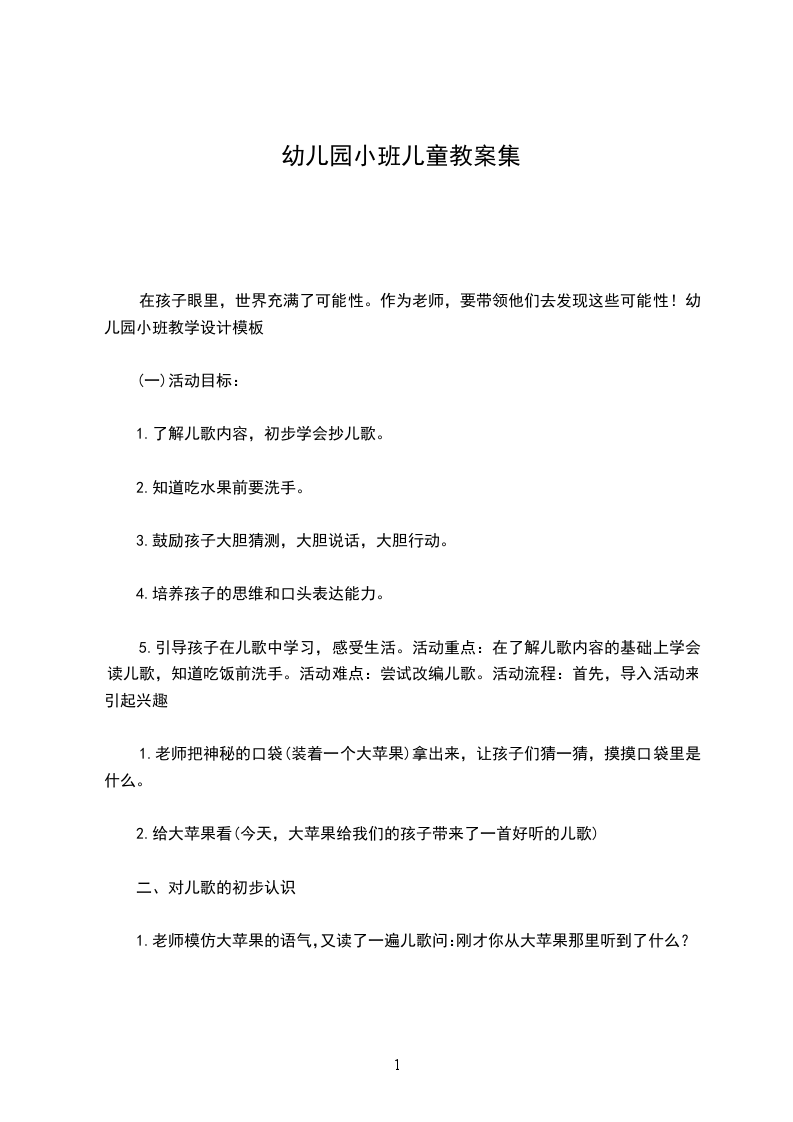 3.孩子们品尝苹果不及物动词对活动的思考这项活动的主要目的是培养孩子良好的文明行为。根据小班幼儿的年龄特点,在儿歌我是一个大苹果的教学活动中,从教材的选择到教学方法的设计,我更多的考虑了小班幼儿的年龄特点:喜欢儿歌,朗朗上口,喜欢角色扮演。铭记特点:活泼好动,对吃东西感兴趣,让孩子在积极愉快的氛围中自然学会读儿歌,并尽量带着兴趣临摹儿歌,在迁移活动中潜移默化地懂得吃饭前洗手。通过活动培养孩子的创造性发散思维,使孩子不仅喜欢吃苹果,还喜欢吃其他水果。七.不足