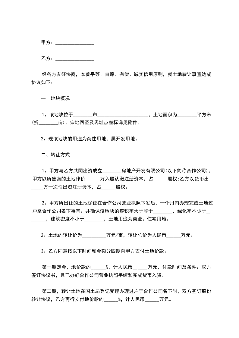 第二期,转让土地在国土局登记受理办理过户于合作公司名下时,双方签订股份转让协议,乙方再行支付地价款的______%,计人民币______万元。