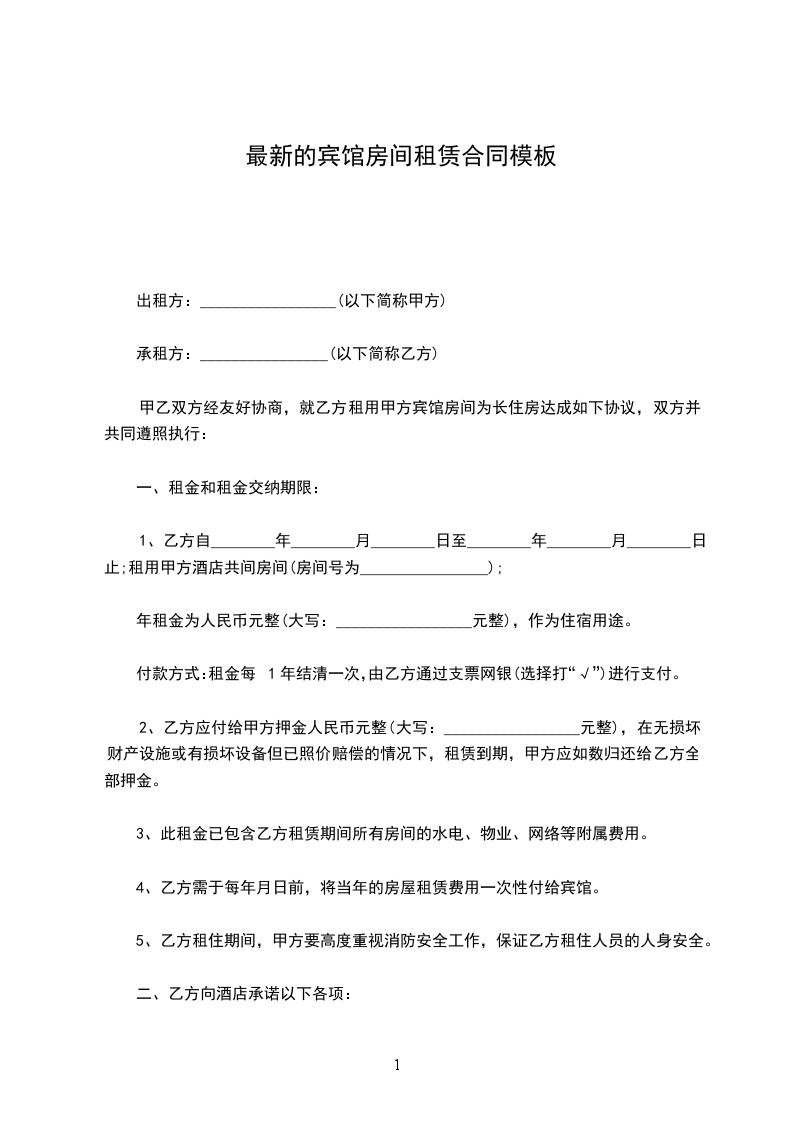 甲乙双方经友好协商,就乙方租用甲方宾馆房间为长住房达成如下协议,双方并共同遵照执行: