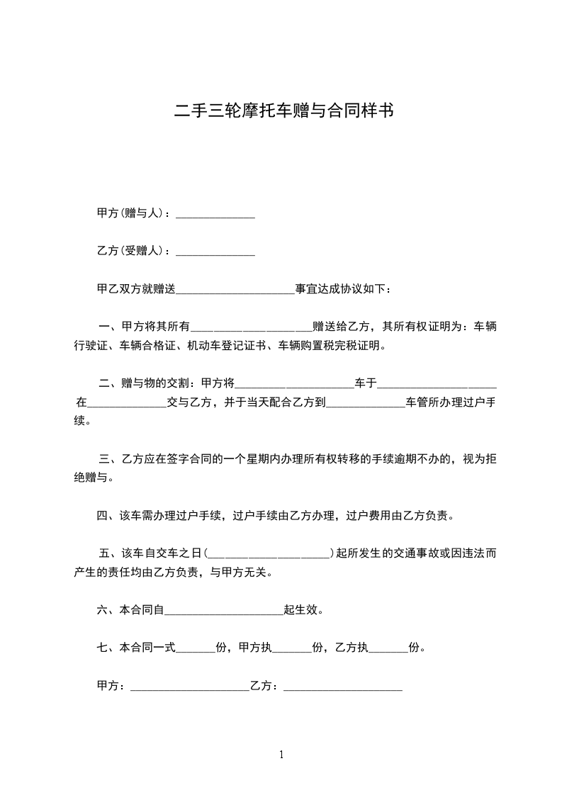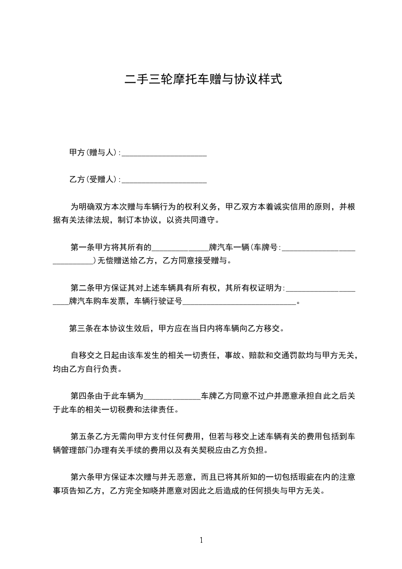 编号:二手三轮摩托车转让协议书甲方:乙方:签订日期:年月日售车方(甲方):身份证号:购车方(乙方):身份证号:甲方将自己所有的一辆色牌三轮摩托车(车牌号:,发动机号:,车架号:,行驶证登记人:)于年月日转让给乙方,双方达成交易金额为人民币贰千捌百元整(Y),经双方协商,达成以下一致协议:自协议签订,甲方向乙方转让车辆、乙方向甲方支付购车款起,该车所有权归乙方,乙方有使用、出售、转让及报废等权利。