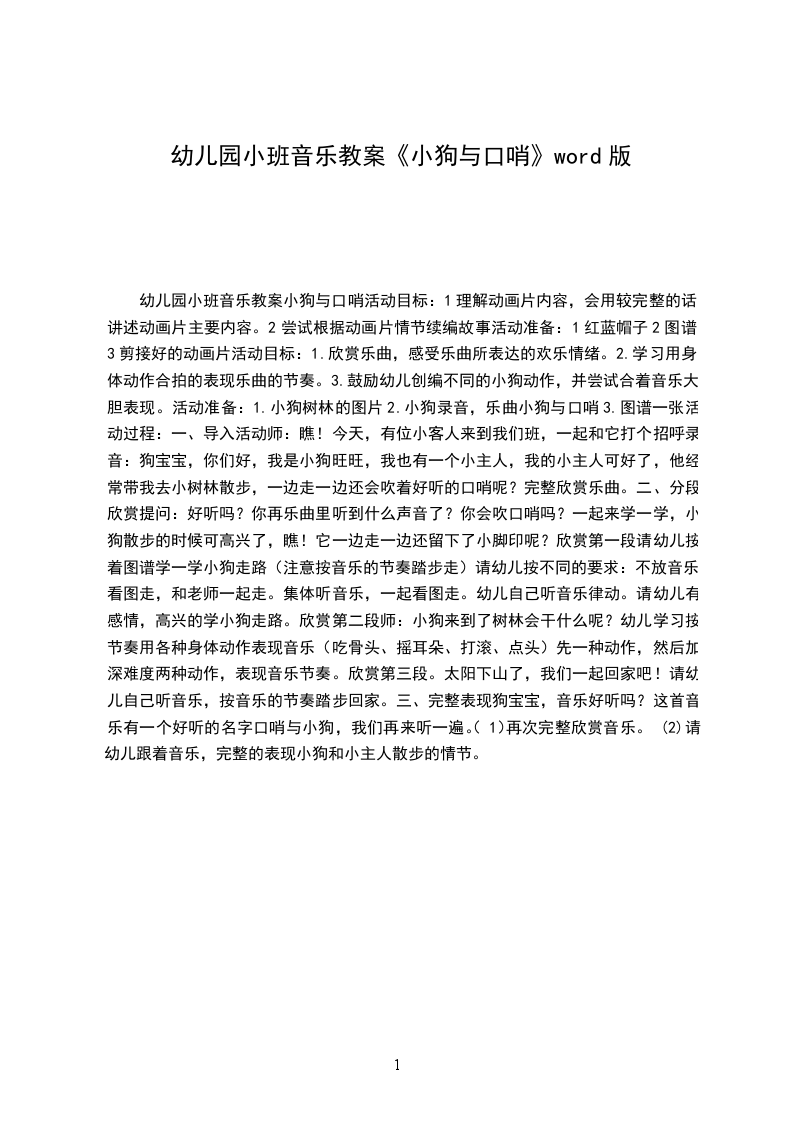 1、音乐欣赏小狗圆舞曲师:小朋友的小手铃真听话,现在把小手铃放好,老师要给小朋友讲个故事,故事里也有只小狗,看看这只小狗在干什么,好不好?(好)(教师讲故事,带领幼儿放音乐跟随音乐玩游戏)