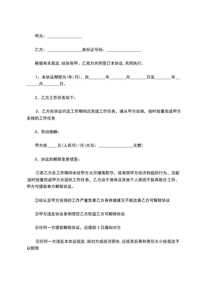 ①若乙方在工作期间未经甲方允许擅离职守,或有损甲方经济利益的行为,没能按时按量完成甲方分派的工作任务,乙方由于身体及其他个人原因不能再胜任工作。甲方可提前单方解除协议。
