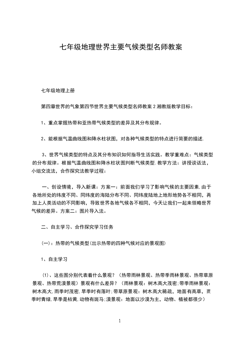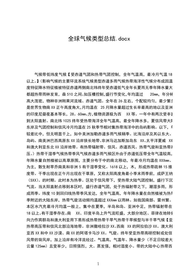 气候带低纬度气候【受赤道气团和热带气团控制,全年气温高,最冷月气温18以上。】(影响气候的主要环流系统气候类型赤道多雨气候热带海洋性气候分布成因温度特征降水特征植被特征赤道两侧南北纬终年受赤道低气全年长夏而无季年降水量大都超热带雨林发育,森510之间。如压槽控制,盛行节变化,年均温过20mm,年分林高大茂密,物种非洲刚果河流域、赤道气团。全年在26左右,个配较均匀,最少繁多,是世界生物南XX正午高度角大,月均温在25月降水量超过生长率最高的地以及亚洲的印度尼昼夜基本等长,28。60mm。方,植物资源极为西XX等。一年中有两次受丰富。到太阳直射。南北纬1025终年受热带海洋全年气温高,最全年降水多,夏信风带大陆东岸及气团控制和信风冷月均温在25秋季节相对集热带海洋中的岛屿影响。以下,年较差比中,但无明显干上,如中美洲加勒赤道多雨气候稍季。比海沿岸及其以东大。岛屿、南美洲巴西高原东XX沿岸狭长地带、非洲马达加斯加岛东XX、太平洋夏威XX和澳大利亚东北XX沿岸地带。有热带辐射带、信风、赤道西风、热带气旋和亚热带高压。)热带干湿季气候热带季风气候赤道多雨气候区外由于赤道低压带全年气温较高,年降水量自然植被以高草原围,主要分布于中的南北移动,年最冷月均温在XXXmm。为主,散生耐旱乔南美和非洲5有干湿季变化。1618以上,木,形成热带疏林15维度带。干季出现在正午月出现在干草原,又称太阳高度角最小季末雨季前,成萨王纳(SXX)。的时期。此时本为热季。区处于信风带下,受热带大陆气团控制,盛行下沉气流。当太阳直射点移到本区时,盛行赤道气团,处于热辐射带之下,潮湿多雨,形成雨季。纬度10到回归线热带季风发达,全年气温高,年年降水量在自然植被为热带季附近的大陆东岸,热带气旋活动频均温超过XXXmm以雨林。如我国南部、雷州繁。本区水汽充最冷月均温一般上,集中在夏季,半岛和岛、亚洲中足,热带辐射带在18以上。有干湿季存在。南XX、印度半岛上升气流旺盛,大部分地区、菲律在地转偏向力作宾群岛和澳大利亚用下易形成热带热带干旱气热带干旱候型与半干旱气候【亚热带高压带和信风北部沿海地带。非洲撒哈拉沙XX、西南XX的阿拉伯沙XX、澳大利亚西XX和中XX沙漠、南XX的阿塔卡马沙XX。气旋。终年受亚热带高呀控制或处信风带的背风岸,加上沿岸有冷洋流经过。气温高,气温年、降水量少(不足日较差大。云量125mm)且变率少,日照强烈,大。蒸发强,相对湿度小。带的大陆中心热带西岸多热带大陆西岸和西岸纬度雾干旱气候1515间】型热带半干旱热带干旱气候区外气候型缘,是干旱气候和湿润气候间的一种过渡类型。亚热带干旱亚热带干中气候由于受沿岸加利福尼亚寒流、秘鲁寒流、加纳利寒流和本格拉寒流影响热带干旱气候向高纬度的延续气温年较差小,气层稳定,降水最冷月均温低于量稀少,多雾的20漠可延伸到海岸带。短暂的雨季,出现在太阳高度角较大的季节,年降水量250750mm。所处纬度稍高,有气旋雨。与热带干旱气候相比,凉季气温纬旱与半干亚热带半干旱气候【南度旱气候北纬2535间的大气陆部和西岸,如北XX、南XX候部分地区、近东、美国西南【热带部、墨西哥北气团和极地气部、阿根廷的团相互作用的帕斯和巴塔哥地带。】最冷尼亚、澳大利月均温低于亚南部。】(在1518,有副热带高压下412个月平沉气流和信风均气温大于带背风岸作用10,四季分下形成。)明。(影响气候的主要环流亚热带季风气候系统有极锋、盛行西风、温较低。亚热带干旱区的外夏季气温稍低冬季降水量稍缘多,能维持草类生长。亚热带大陆东岸,热带海洋气团和月均温一般年降水量在常绿阔叶林,自然纬度2535间,极地大陆气团交高于22,最冷XXXmm以景观表现为亚热带如我国岭淮河以替控制地带。夏月气温在015上,夏半年降水季风林。南、热带季风气候热冬冷,四季分量通常占全年的带气旋和反气旋、亚热带高压和热带气旋等。)天气的亚热带湿润气候非周期性变化和降水的季节性变化都很显著。亚热带夏干气候(地中XX气候)【冬暖湿润,夏热干燥,高温和多雨不一致。】以北地区,日本和明,季风发达。之间。70%。朝鲜半岛南部。在南北纬25纬度位置、海陆气候特征与亚热降水量年分配较自然景观亦与亚热35间的北XX位置和东XX热带带季风气候区相亚热带季风气候带季风区相似。大陆东岸、墨西XX季风气候区相似,但冬夏温差区均匀。冬季温湾沿岸、南XX和似,但海陆热力比亚热带季风气带气旋活动频非洲的东南海岸及差异不如东XX小。繁,冬雨可占年澳大利亚东岸。出,因此未形成降水总量的40%。季风气候。南北纬3040夏季受副高中心最冷月气温在年降水量约为植被以硬叶常绿灌之间的大陆西岸,或其东缘影响,410左右XXXmm。木林为主。如地中XX沿岸、加气流下沉,不利利福尼亚沿岸、智于雨云产生,十利中部沿岸、非洲分炎热。冬季副和澳大利亚南段。热带高压南移,受西风带控制,气旋活动下沉,温暖、多雨。温带海洋性气候在纬度4060终年盛行西风,冬暖夏凉,气温气旋活动频繁,植被在偏南地区以的温带大陆西岸。受海洋气团控年较差小。最冷全年湿润,冬雨夏绿阔叶林为主,欧洲西北部的英月气温在0以相对较多。年降北部为针阔混交温带季风气候【冬夏风向差别显著,季节变化明显,天气非周期性变化突