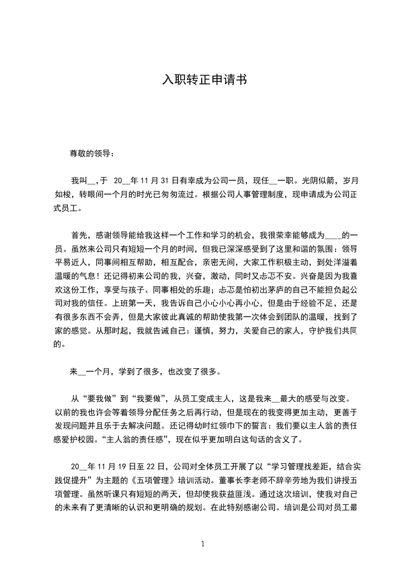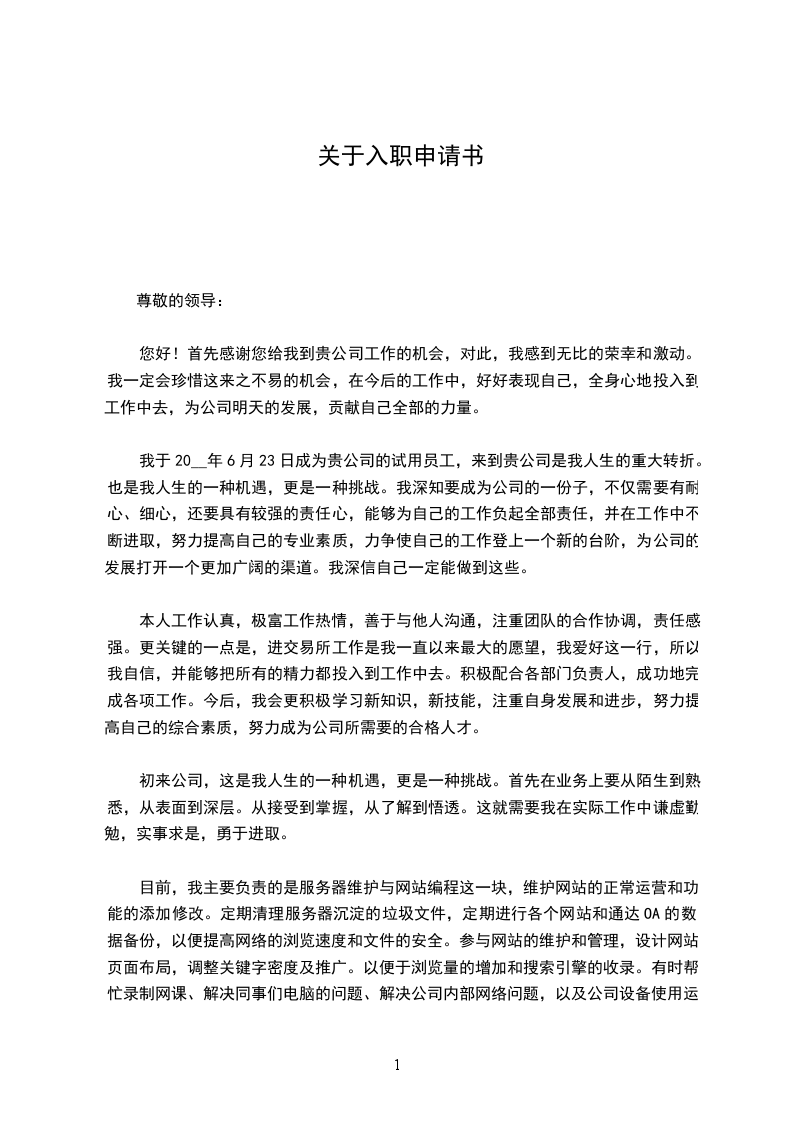 这是我的正式的第一份工作,这半年来我学到了很多,感悟了很多;希望以一名正式员工的身份在这里工作,实现自己的奋斗目标,体现自己的人生价值,和公司一起成长。在此我提出入职申请,恳请领导给我锻炼自己、实现理想的机会。我会用谦虚的态度和饱满的热情做好我的本职工作,为公司创造价值,同公司一起展望美好的未来!