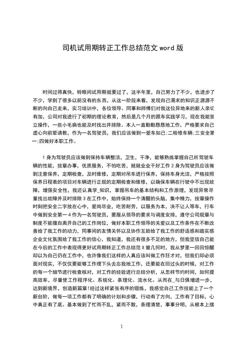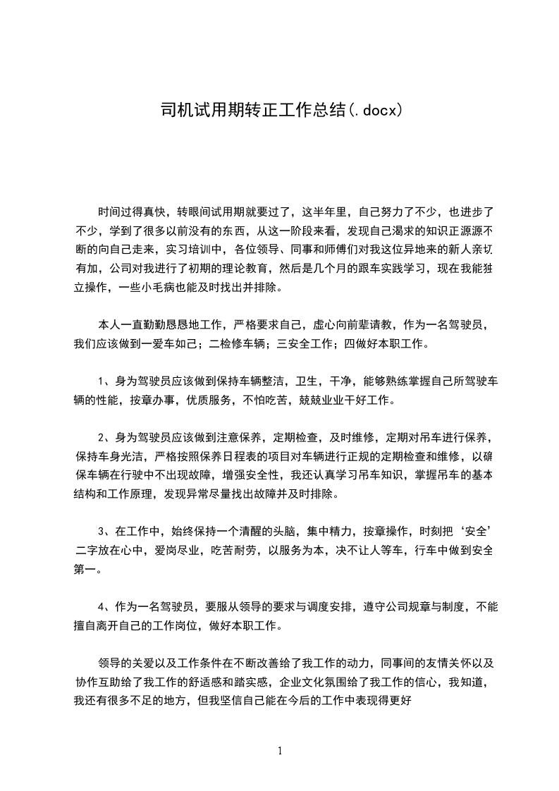 1身为驾驶员应该做到保持车辆整洁,卫生,干净,能够熟练掌握自己所驾驶车辆的性能,按章办事,优质服务,不怕吃苦,兢兢业业干好工作2身为驾驶员应该做到注意保养,定期检查,及时维修,定期对吊车进行保养,保持车身光洁,严格按照保养日程表的项目对车辆进行正规的定期检查和维修,以确保车辆在行驶中不出现故障,增强安全性,我还认真学_知识,掌握吊车的基本结构和工作原理,发现异常尽量找出故障并及时排除3在工作中,始终保持一个清醒的头脑,集中精力,按章操作,时刻把安全二字放在心中,爱岗尽业,吃苦耐劳,以服务为本,决不让人等车,行车中做到安全第一4作为一名驾驶员,要服从领导的要求与调度安排,遵守公司规章与制度不能擅自离开自己的工作岗位,做好本职工作领导的关爱以及工作条件在不断改善给了我工作的动力,同事间的友情关怀以及协作互助给了我工作的舒适感和踏实感,企业文化氛围给了我工作的信心,我知道,我还有很多不足的地方,但我坚信自己能在今后的工作中表现得更好试用期转正工作总结范X曾几何时,我从梦里一回回惊醒,却以为自己仍在工作中,也许像我们这样的人真应该叫做工作狂才对,但我们却必须面对现实,不仅仅要能够工作埋下头去忘我地工作,还要能在回过头的时候,对工作的每一个细节进行检查核对,对工作的经验进行总结分析,从怎样节约时间,如何提高效率,尽量使工作程序化、系统化、条理化、流水化。从而在_与日俱增进一步,达到新境界,创造新篇章!经过这样紧张有序的锻炼,我感觉自己工作技能上了一个新台阶,做每一项工作都有了明确的计划和步骤,行动有了方向,工作有了目标,心中真正有了底。基本做到了忙而不乱,紧而不散,条理清楚,事事分明,从根本上摆脱了过去只顾埋头苦干,不知总结经验的现象。我是一名大四的学生,我在易初莲花工作中让我懂得了很多,作为一个大学生没有社会经验的人是不完整的,因此我必须紧密地和社会联系在一起,和它成为一个整体,通过工作,我明白了很多,比如我懂得如何去和同伴团结在一起,挖掘每个人的优势,发扬团队精神,高质量地完成任务。要知道一个人的力量是弱小的,_力量是强大的。换句话说,积水成河,积沙成丘。同样在工作中我们也必须尽可能的帮助我们团队里的成员,一旦某个成员遇上了困难,我们应该毫不犹豫的去帮助他,使他感到_温暖。这时他就会有这样的想法:因为我的团体好温暖,定要好好努力。假如_的某一成员在那边努力的工作,那么其他_成员也会受到感染。在团队中我们要绝对服从上级的命令,一个有纪律的团体本身就是一个好的团体,我相信在纪律保证下的团体无论他的质量还是速度,绝对是优秀的。你看在军队里,哪个队没有纪律,norule,nosuccess.在学到工作经验的同时,我也懂得了市场的重要性,这也是因为经济体制结构所影响的,_场经济占主导地位的情况下,经济的发展要密切联系市场这个大的环境,没有它,一切也不用谈,因为没有市场也就没有顾客,那没有顾客我们去赚谁的钱呢?在我看来,大型超市是将来的社会发展趋势,因为超市有几大优点: