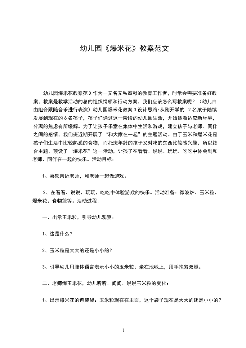 幼儿园爆米花教案范X作为一无名无私奉献的教育工作者,时常会需要准备好教案,教案是教学活动的总的组织纲领和行动方案。我们应该怎么写教案呢?(幼儿自由组合跟随音乐进行表演)幼儿园爆米花教案3设计思路:从刚开学的2名孩子陆续发展到现在的6名孩子,孩子们通过这一阶段的幼儿园生活,开始逐渐适应新环境,分离的焦虑有所缓解。为了让孩子乐意在集体中生活和游戏,建立孩子与老师、同伴之间的感情,我们班近期开展了“和大家在一起”的主题活动。由于玉米和爆米花是孩子们生活中比较熟悉的食物,而托班年龄的孩子又对吃的东西比较感兴趣,所以结合主题,预设了“爆米花”这一活动,让孩子在看看、说说、玩玩、吃吃中体会到和老师、同伴在一起的快乐。活动目标: