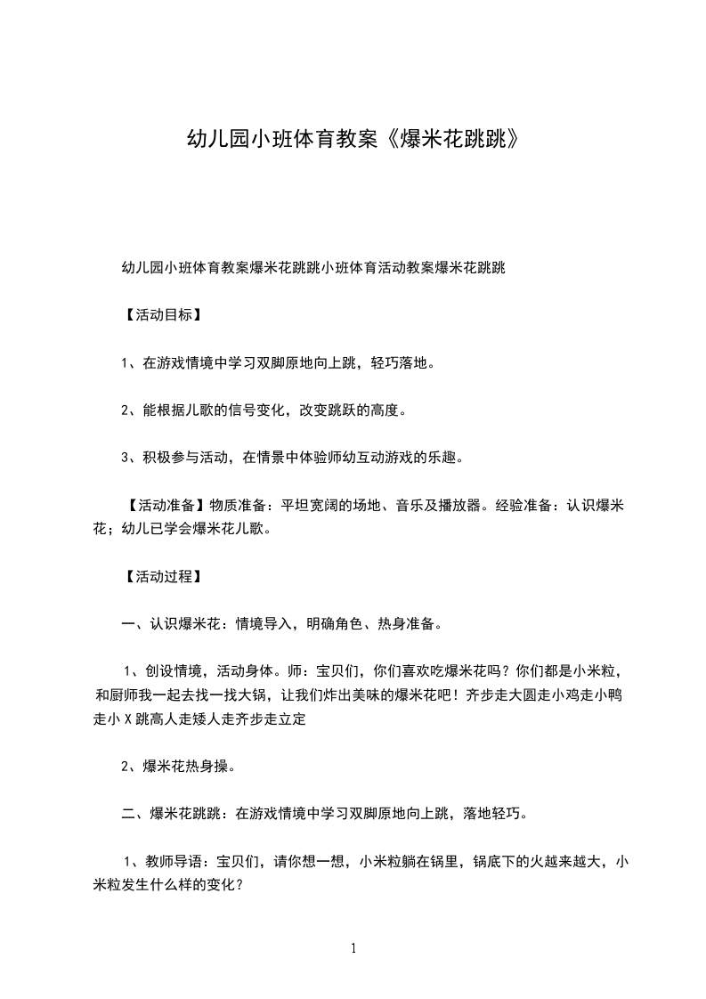 1、交代游戏玩法:孩子装扮玉米粒,蹲在地上;老师装扮爆米花的,在幼儿中间边走边摸幼儿的头,并模仿爆米花的声音。老师发出“砰”的一声,表示玉米花爆好,幼儿站起边跳边拍手。