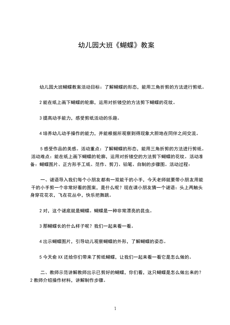 幼儿园大班蝴蝶教案活动目标:了解蝴蝶的形态,能用三角折剪的方法进行剪纸。