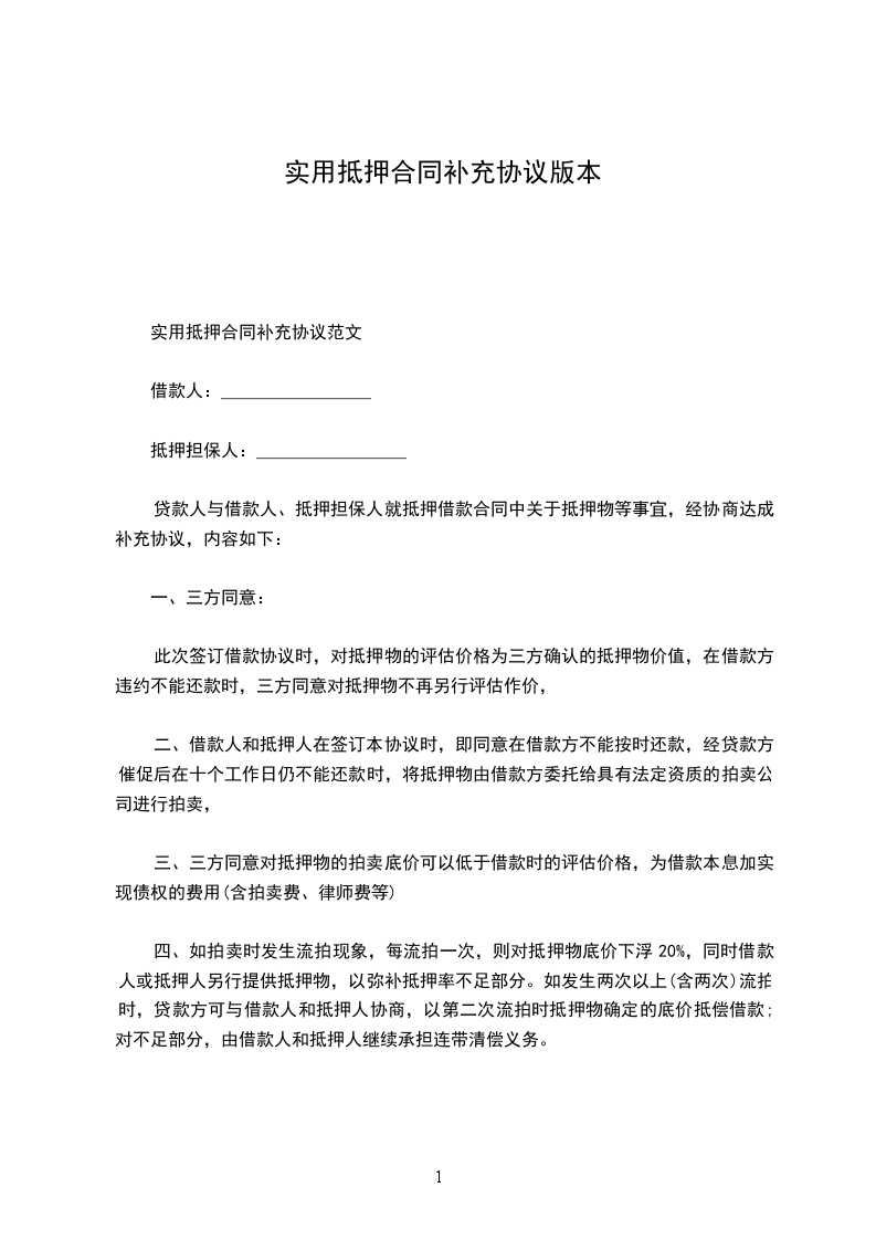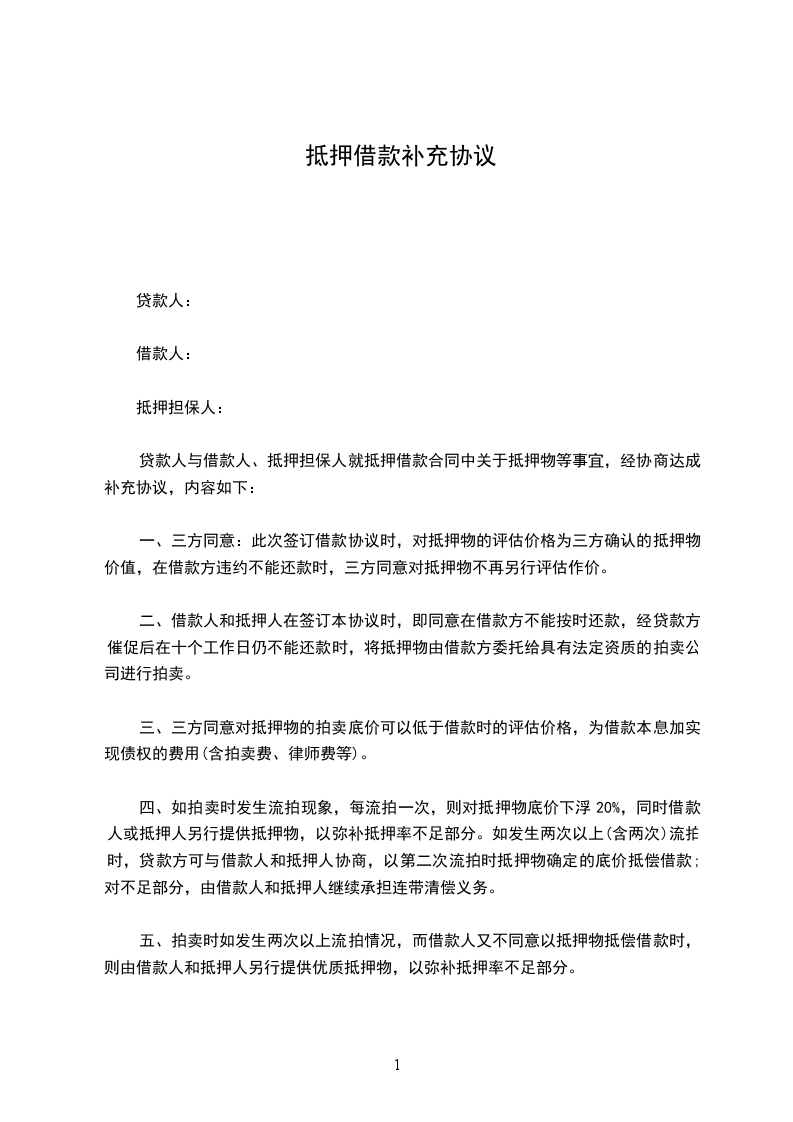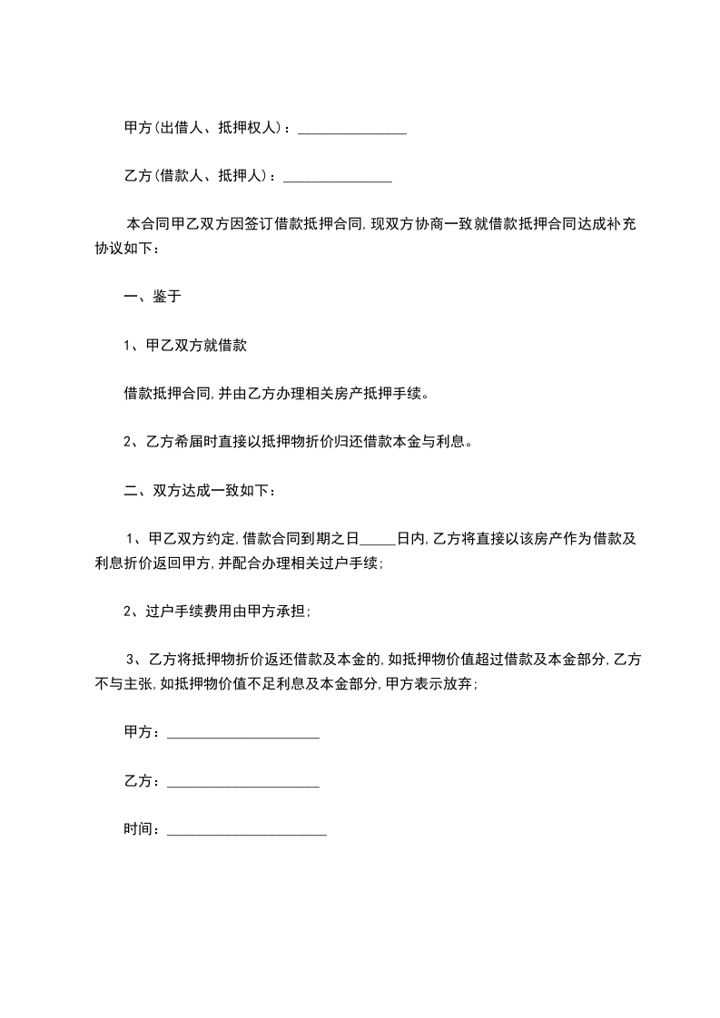 本合同甲乙双方因签订借款抵押合同,现双方协商一致就借款抵押合同达成补充协议如下: