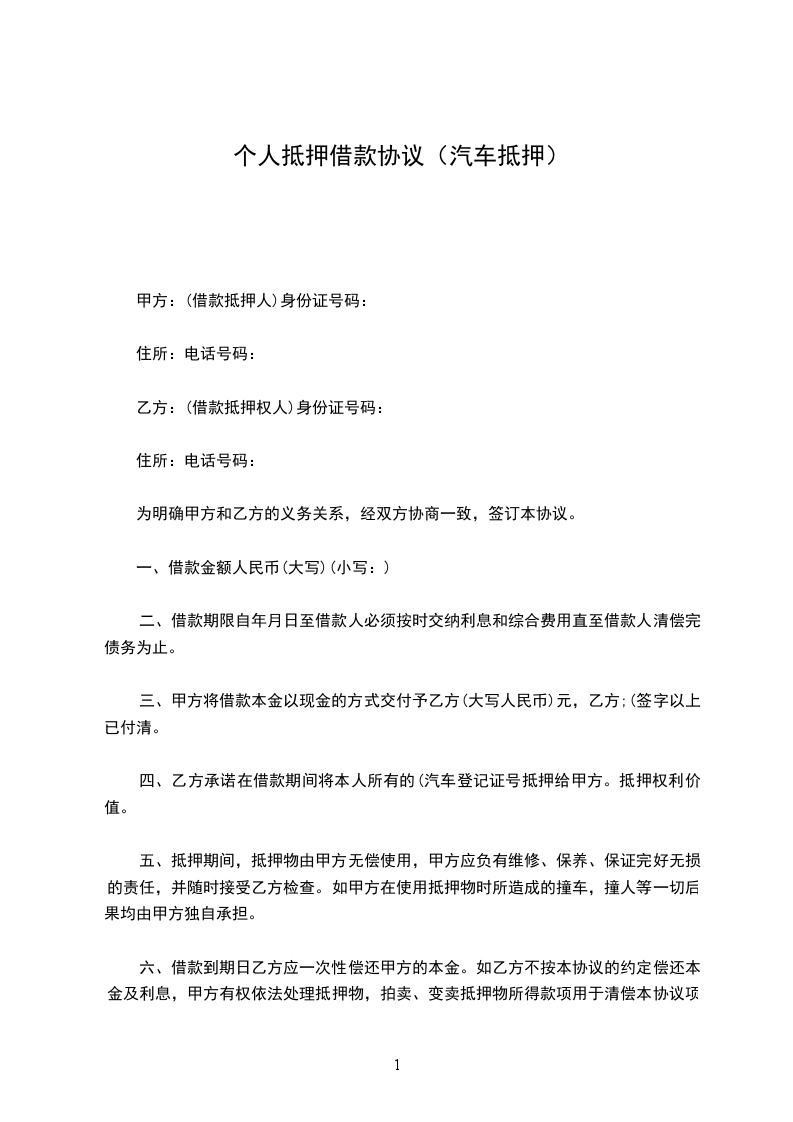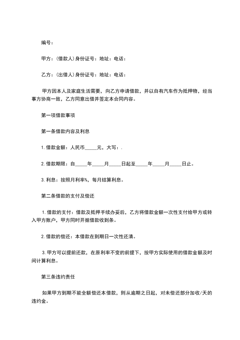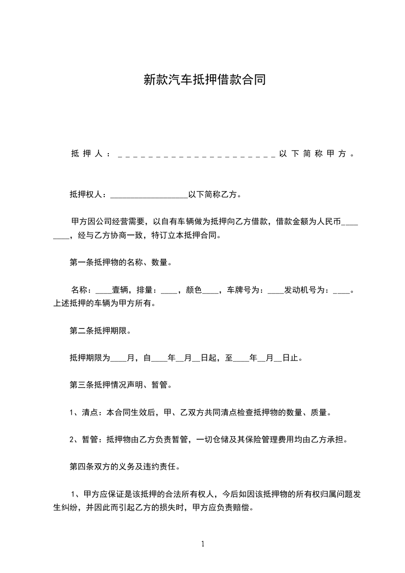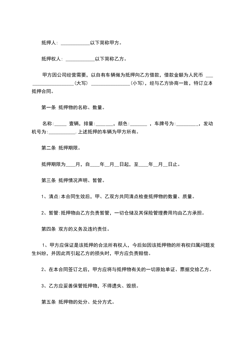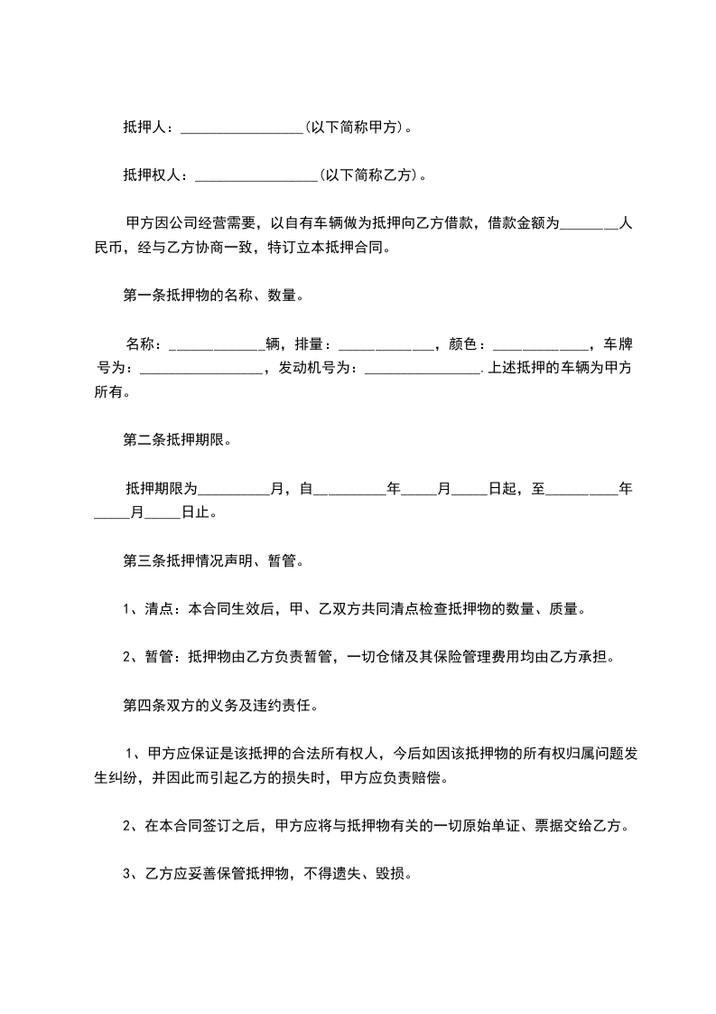 名称:_____________辆,排量:_____________,颜色:_____________,车牌号为:_________________,发动机号为:________________.上述抵押的车辆为甲方所有。