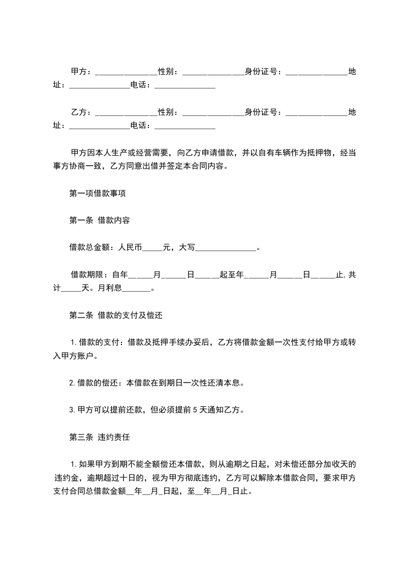 甲方因公司经营需要,以自有车辆做为抵押向乙方借款,借款金额为________人民币,经与乙方协商一致,特订立本抵押合同。