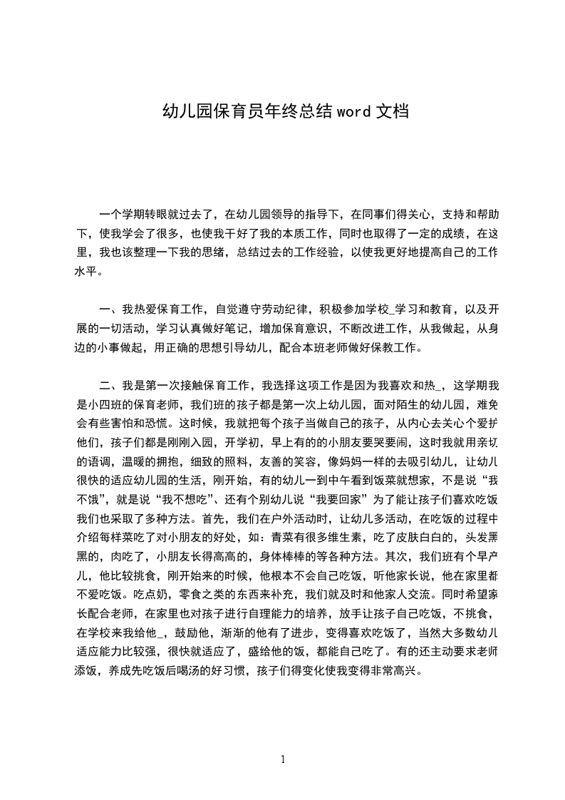 二、我是第一次接触保育工作,我选择这项工作是因为我喜欢和热_,这学期我是小四班的保育老师,我们班的孩子都是第一次上幼儿园,面对陌生的幼儿园,难免会有些害怕和恐慌。这时候,我就把每个孩子当做自己的孩子,从内心去关心个爱护他们,孩子们都是刚刚入园,开学初,早上有的的小朋友要哭要闹,这时我就用亲切的语调,温暖的拥抱,细致的照料,友善的笑容,像妈妈一样的去吸引幼儿,让幼儿很快的适应幼儿园的生活,刚开始,有的幼儿一到中午看到饭菜就想家,不是说“我不饿”,就是说“我不想吃”、还有个别幼儿说“我要回家”为了能让孩子们喜欢吃饭,我们也采取了多种方法。首先,我们在户外活动时,让幼儿多活动,在吃饭的过程中介绍每样菜吃了对小朋友的好处,如:青菜有很多维生素,吃了皮肤白白的,头发黑黑的,肉吃了,小朋友长得高高的,身体棒棒的等各种方法。其次,我们班有个早产儿,他比较挑食,刚开始来的时候,他根本不会自己吃饭,听他家长说,他在家里都不爱吃饭。吃点奶,零食之类的东西来补充,我们就及时和他家人交流。同时希望家长配合老师,在家里也对孩子进行自理能力的培养,放手让孩子自己吃饭,不挑食,在学校来我给他_,鼓励他,渐渐的他有了进步,变得喜欢吃饭了,当然大多数幼儿适应能力比较强,很快就适应了,盛给他的饭,都能自己吃了。有的还主动要求老师添饭,养成先吃饭后喝汤的好习惯,孩子们得变化使我变得非常高兴。
