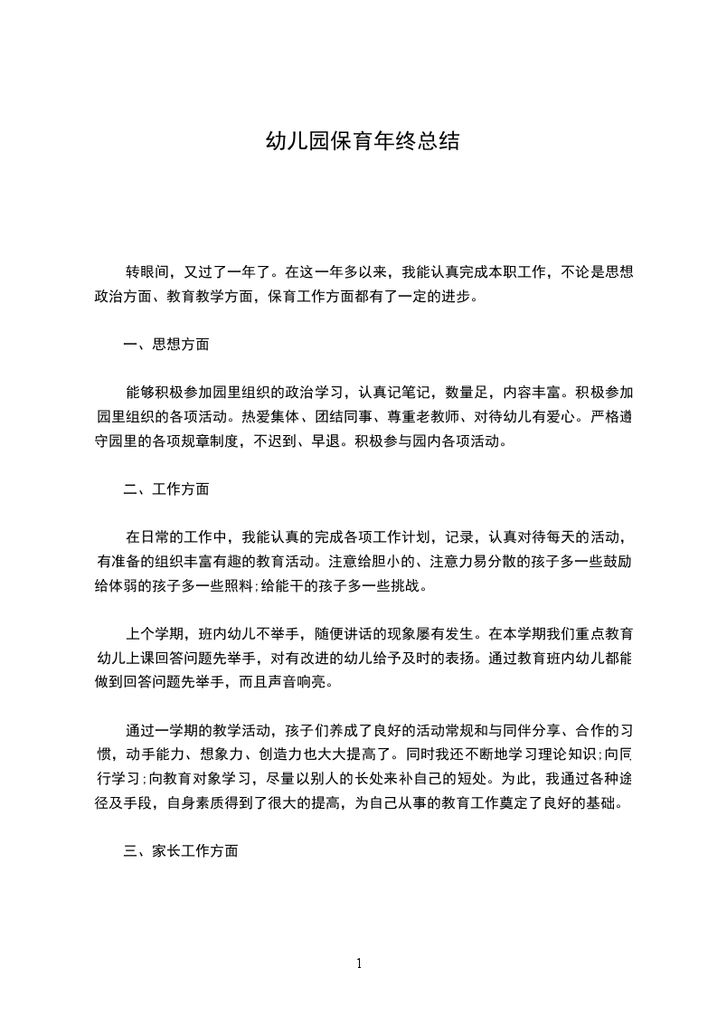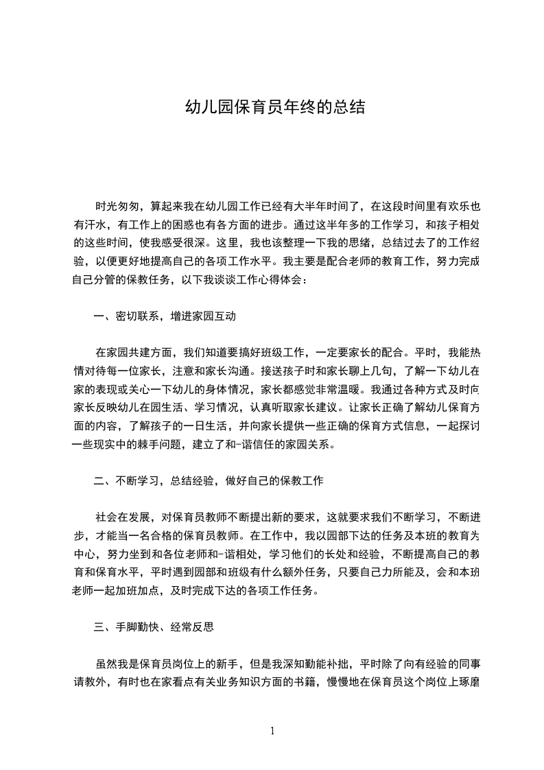 三、在卫生保健方面,我以培养幼儿各种生活习惯为主,帮助幼儿认识自己的杯子,毛巾,培养幼儿饭前便后要洗手,饭后要擦嘴,漱口的好习惯。孩子们都很小,自理能力都很差,因此在大小便时都要老师给予帮助。有的幼儿还尿裤子,这时我就把他弄脏的身子擦洗干净,换上干净的衣裤,并把弄脏的衣裤洗干净,晾干。在午睡时,王XX要上两次厕所,并且要按时提醒他,听他家长说,他在家睡觉时都要用尿不湿,但是他在幼儿园,通过老师的提醒和培养,他很少流尿了。活动时,对出汗多的幼儿,我及时给幼儿们擦汗,隔背,以防感冒。随着天气的变化,要给幼儿增减衣服,对体弱多病的幼儿给予特殊照顾。我们班有一对龙凤胎,身体比较差,比较怕冷,我也要随时_们的冷热情况,给他们增减衣服。我每天认真的做好消毒工作,减少有害细菌的滋生,总之,保育老师是生活老师,对幼儿来说是非常重要的,他们来到园的每一天都是由我照顾,要想取得幼儿的喜欢,家长的信任,就要像妈妈一样,要用自己的热情,爱心,细心,耐心去照顾他们。通过一学期的共同生活和学习,我与幼儿们建立了深厚的感情,在玩的过程中,有的幼儿还不由自主的喊“徐XX,徐XX的”。我问他有什么事吗?他说“没有”,就是对我甜甜的笑,可见我在他们心中占取了一定的位置,孩子们甜甜的笑脸,开心的笑声,使我越来越喜欢这些小天使了当然,我在工作中也有粗心,有做得不周的地方,在今后的工作中,我一定不断总结经验,配合老师,吸取教训,努力做好本质工作。粗略总结,如有不妥之处,请领导和同事们批评与指导。