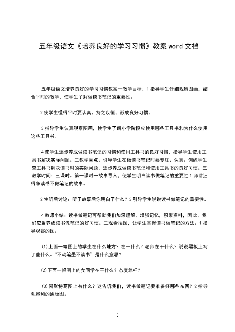 五年级语文培养良好的学习习惯教案一教学目标:1指导学生仔细观察图画,结合平时的教学,使学生了解做读书笔记的重要性。