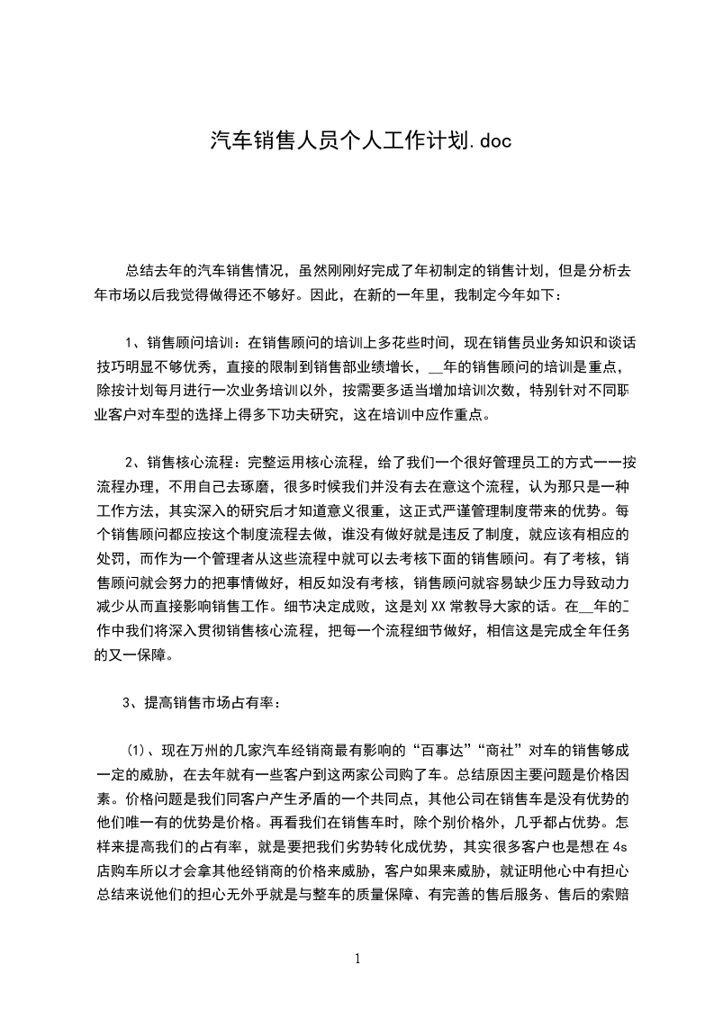 总结去年的汽车销售情况,虽然刚刚好完成了年初制定的销售计划,但是分析去年市场以后我觉得做得还不够好。因此,在新的一年里,我制定今年如下: