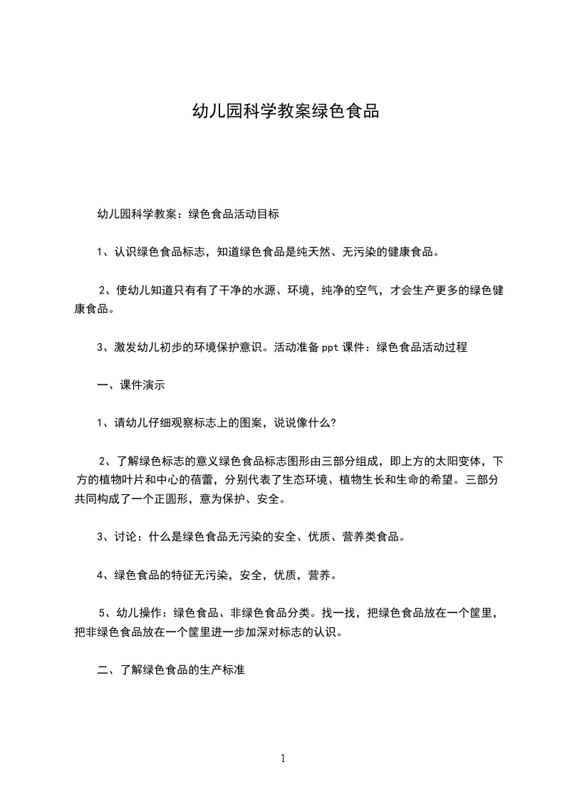 幼儿园科学教案:绿色食品活动目标