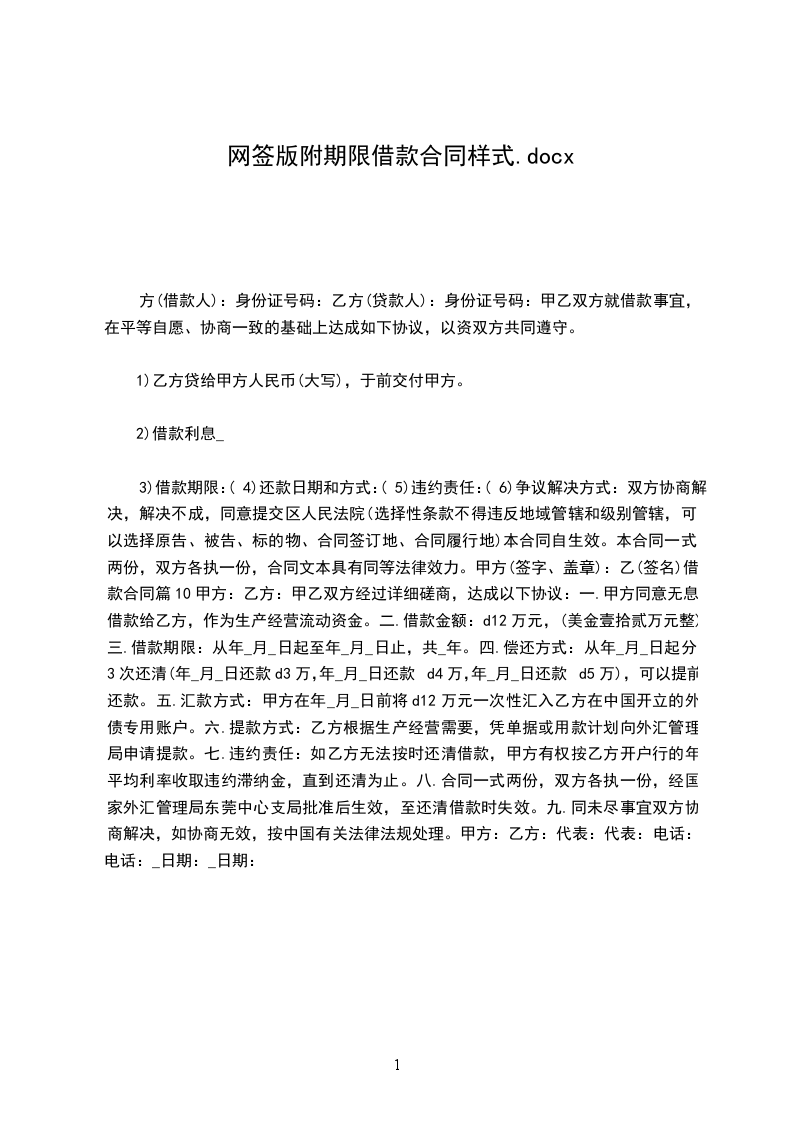 3)借款期限:(4)还款日期和方式:(5)违约责任:(6)争议解决方式:双方协商解决,解决不成,同意提交区人民法院(选择性条款不得违反地域管辖和级别管辖,可以选择原告、被告、标的物、合同签订地、合同履行地)本合同自生效。本合同一式两份,双方各执一份,合同文本具有同等法律效力。甲方(签字、盖章):乙(签名)借款合同篇10甲方:乙方:甲乙双方经过详细磋商,达成以下协议:一.甲方同意无息借款给乙方,作为生产经营流动资金。二.借款金额:d12万元,(美金壹拾贰万元整)。三.借款期限:从年_月_日起至年_月_日止,共_年。四.偿还方式:从年_月_日起分3次还清(年_月_日还款d3万,年_月_日还款d4万,年_月_日还款d5万),可以提前还款。五.汇款方式:甲方在年_月_日前将d12万元一次性汇入乙方在中国开立的外债专用账户。六.提款方式:乙方根据生产经营需要,凭单据或用款计划向外汇管理局申请提款。七.违约责任:如乙方无法按时还清借款,甲方有权按乙方开户行的年平均利率收取违约滞纳金,直到还清为止。八.合同一式两份,双方各执一份,经国家外汇管理局东莞中心支局批准后生效,至还清借款时失效。九.同未尽事宜双方协商解决,如协商无效,按中国有关法律法规处理。甲方:乙方:代表:代表:电话:电话:_日期:_日期: