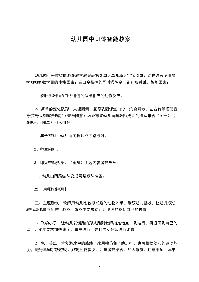 幼儿园小班体智能游戏教学教案表第2周大单兀新兵宝宝周单兀动物语言使用器材CDCDM教学目的体能因素:在口令指挥的同时锻炼变向跑和各种跳。智能因素: