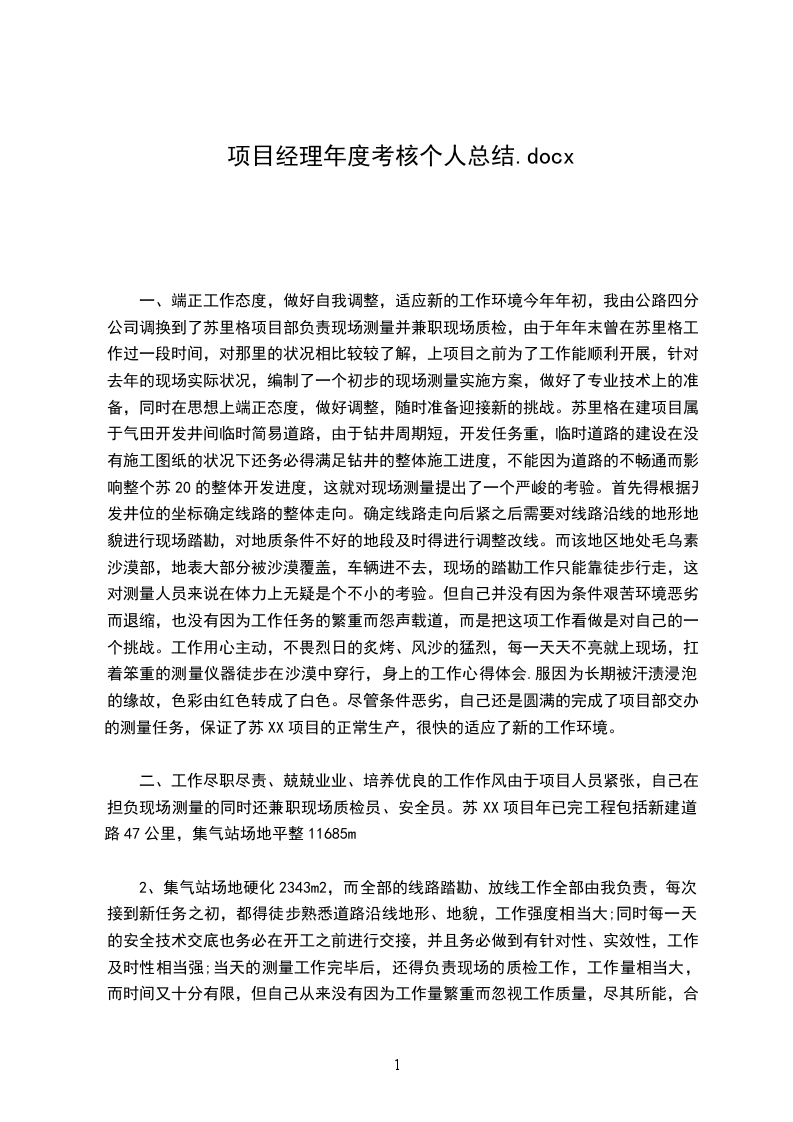二、工作尽职尽责、兢兢业业、培养优良的工作作风由于项目人员紧张,自己在担负现场测量的同时还兼职现场质检员、安全员。苏XX项目年已完工程包括新建道路47公里,集气站场地平整11685m