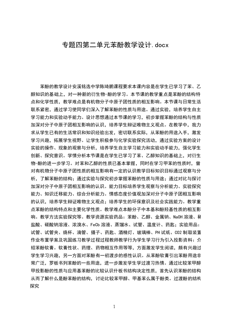 苯酚的教学设计安溪铭选中学陈琦鹏课程要求本课内容是在学生已学习了苯、乙醇知识的基础上,对一种新的衍生物-酚的学习。本节课的教学重点是苯酚的结构特点和化学性质,教学难点是有机物分子中原子团性质的相互影响。本节课与日常生活联系紧密,通过学习使同学们深入了解苯酚的性质与用途。通过实验,培养学生自主学习能力和实验动手能力。设计思想通过本节课的学习,初步掌握苯酚的结构与性质,加深对分子中原子团相互影响的认识,培养学生辩证唯物主义观点。在教学中,我力求从学生已有的生活常识和知识经验出发,密切联系实际,从苯酚的用途入手,激发学习兴趣,拓展学生视野。让学生积极参与化学实验探究活动,通过实验方案的设计、实验的操作、现象的观察与分析,培养学生自主学习能力和实验动手能力,强化学生创新、探究意识。学情分析本节课是在学生已学习了苯、乙醇知识的基础上,对衍生物-酚的进一步学习。对苯和乙醇的性质已基本掌握,同时在学习甲苯的性质时,曾对有机物分子中原子团性质的相互影响有一定的认识教学目标知识目标通过观察与分析,了解苯酚的结构;通过实验与探究初步掌握苯酚的性质与用途;通过对比与探讨加深对分子中原子团相互影响的认识。能力目标培养学生观察与分析能力、实验探究能力、知识迁移能力、综合分析能力。情感态度价值观加深对分子中原子团相互影响的认识,培养学生辩证唯物主义观点;培养学生的环保意识及社会实践能力。教学重点苯酚的结构特点和主要化学性质。教学难点本酚分子中本基和酚羟基性质的相互影响。教学方法实验探究等。教学资源实验药品:苯酚、乙醇、金属钠、NaOH溶液、稀盐酸、碳酸钠溶液、浓溴水、FeCb溶液、蒸馏水、试管、温度计、药匙;实验用品:试管、试管夹、烧杯、滴管、摄子、药匙、酒精灯、玻璃棒、PH试纸、CO2制取装置作业布置学案及巩固练习教学过程过程教师教学行为学生学习行为引入投影资料:介绍苯酚软膏。软膏性状、药理、药物相互作用等等,方面激发学生阅读,颇有兴趣过学生学习兴趣,另一方面对苯酚有一初渡步的感性认识。从苯酚软膏引出苯酚用途非常广泛,罗板书列苯酚的一些用途,进一步激发学生学过渡习热情。通过比较苯甲醇、甲投影酚的性质与应用基苯酚的比较认识什板书结构决定性质,首先认识苯酚的结构,从而了解什么是酚苯酚的结构,讨论比较苯甲醇、甲基苯么属于酚类。过渡酚的结构探究