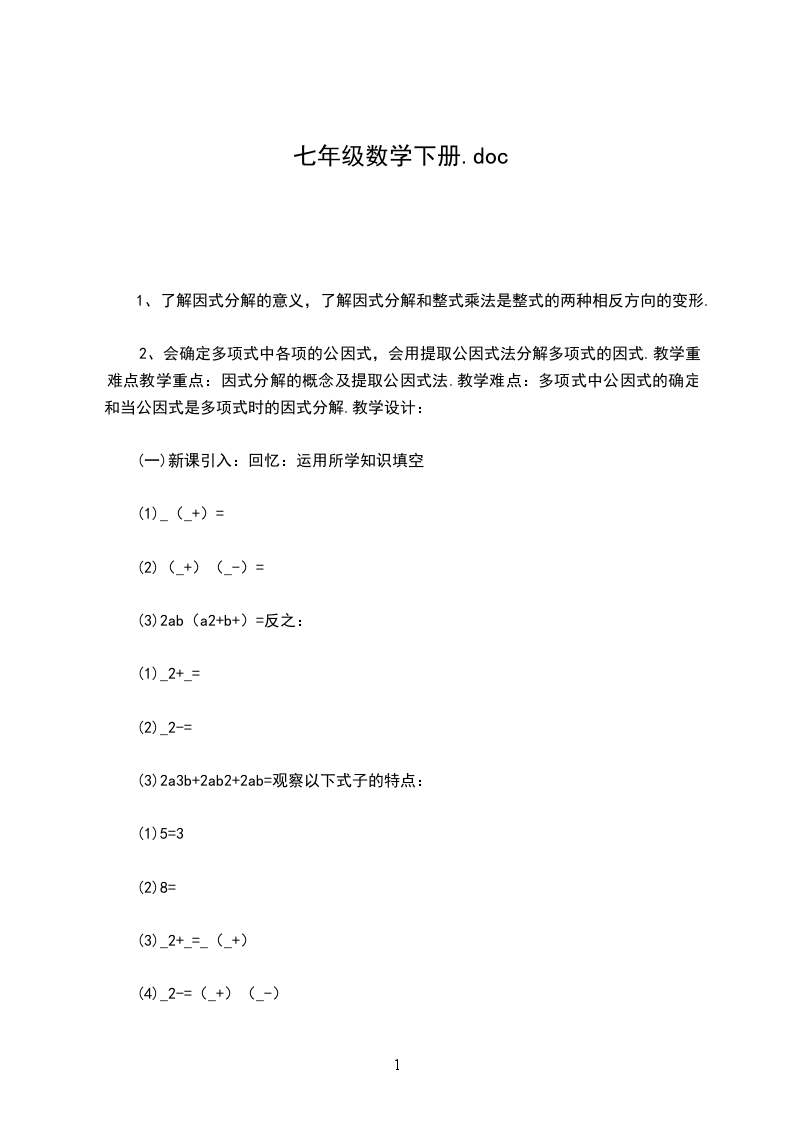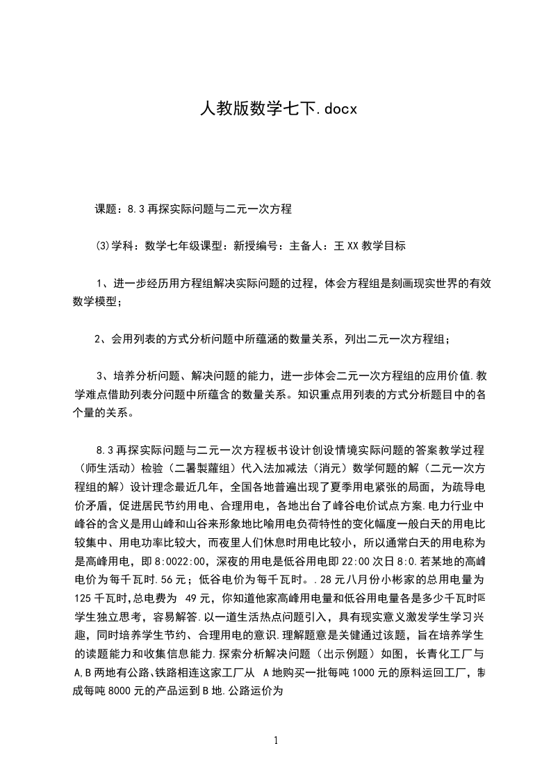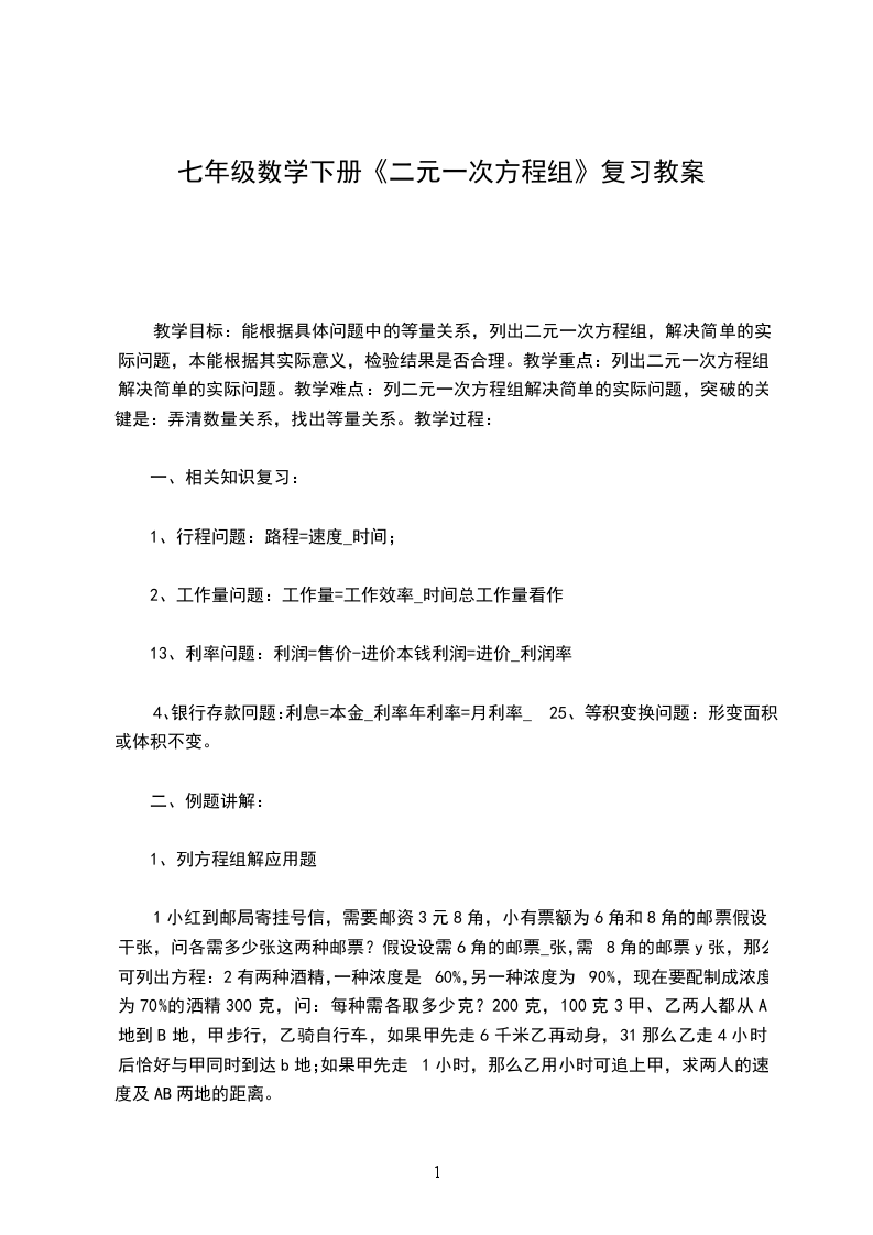 2、二元一次方程组:了解二元一次方程组及其相关概念,能设两个未知数并列方程组表示实际问题中的两种相关的等量关系。了解解二元一次方程组的基本目标(化成_=a,y=b的形式),体会消元思想;通过实际问题,提高分析问题、解决问题的能力。