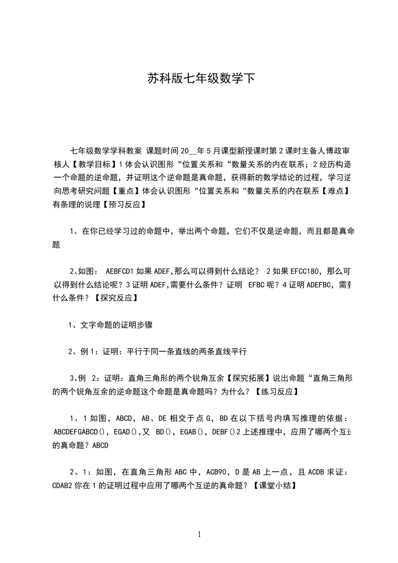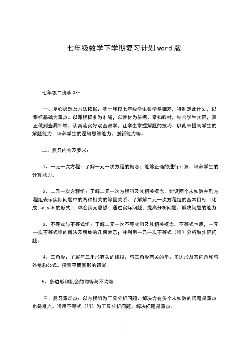 五、课时安排:一元一次方程2课时二元一次方程组2课时不等式2课时三角形2课时多边形2课时机会的均等与不等2课时20__年6月学校:望水九义校班级:七年级二班教师:李XX