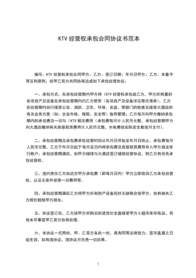编号:KTV经营权承包合同甲方:乙方:签订日期:年月日甲方:乙方:本着平等互利原则,经甲乙双方共同协商达成如下承包经营协议: