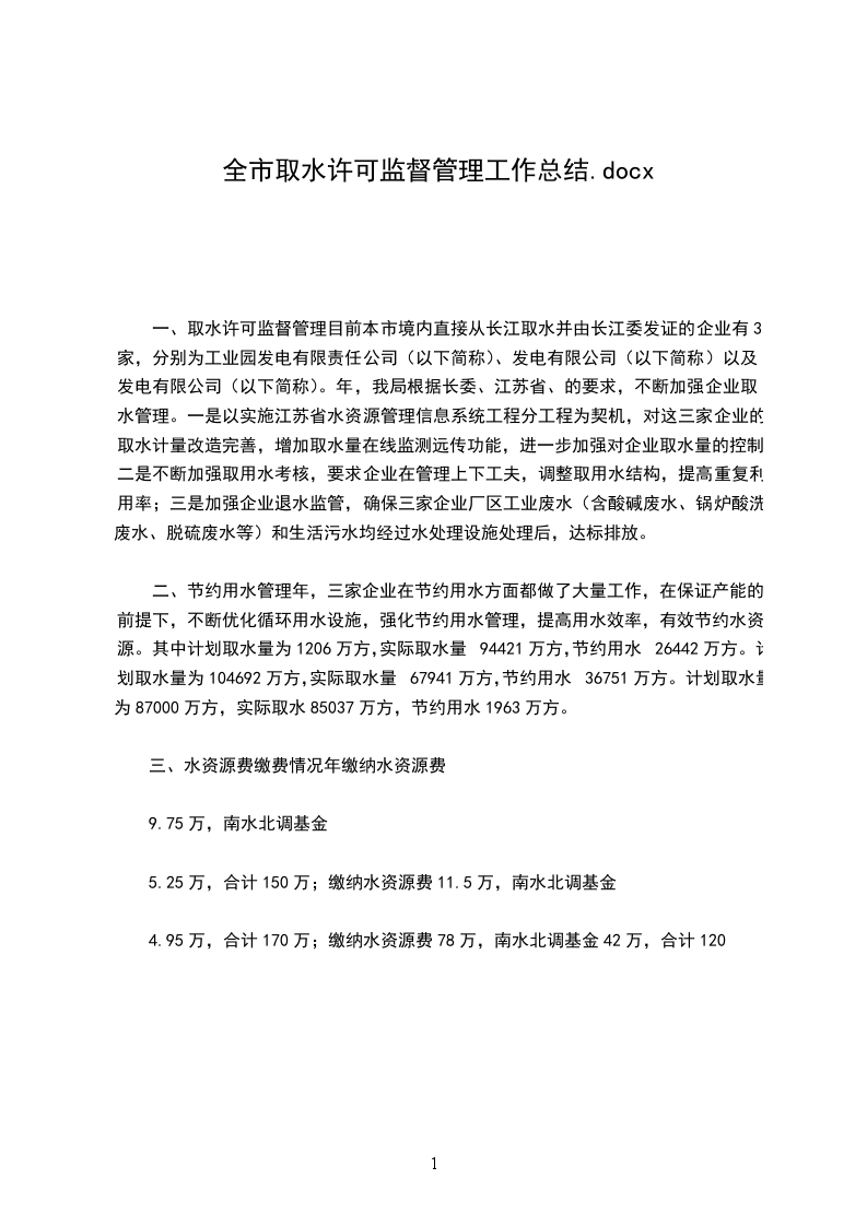 一、取水许可监督管理目前本市境内直接从长江取水并由长江委发证的企业有3家,分别为工业园发电有限责任公司(以下简称)、发电有限公司(以下简称)以及发电有限公司(以下简称)。年,我局根据长委、江苏省、的要求,不断加强企业取水管理。一是以实施江苏省水资源管理信息系统工程分工程为契机,对这三家企业的取水计量改造完善,增加取水量在线监测远传功能,进一步加强对企业取水量的控制;二是不断加强取用水考核,要求企业在管理上下工夫,调整取用水结构,提高重复利用率;三是加强企业退水监管,确保三家企业厂区工业废水(含酸碱废水、锅炉酸洗废水、脱硫废水等)和生活污水均经过水处理设施处理后,达标排放。