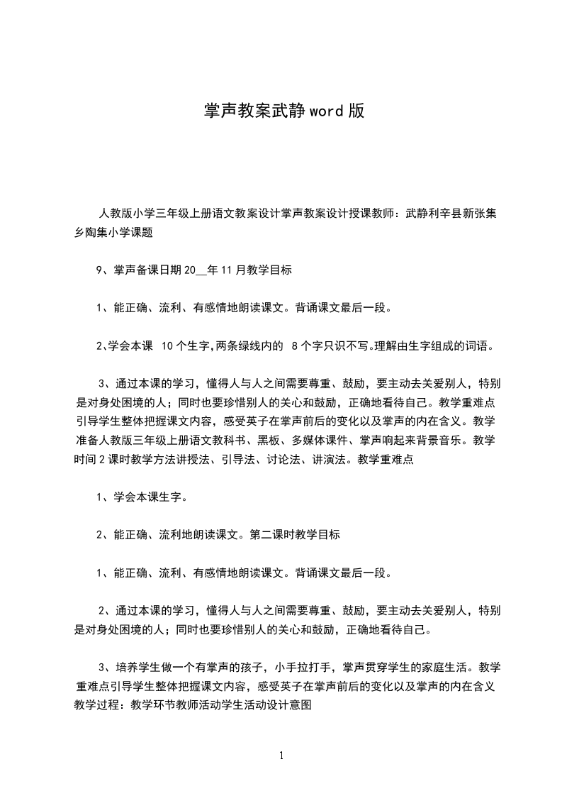 人教版小学三年级上册语文教案设计掌声教案设计授课教师:武静利辛县新张集乡陶集小学课题