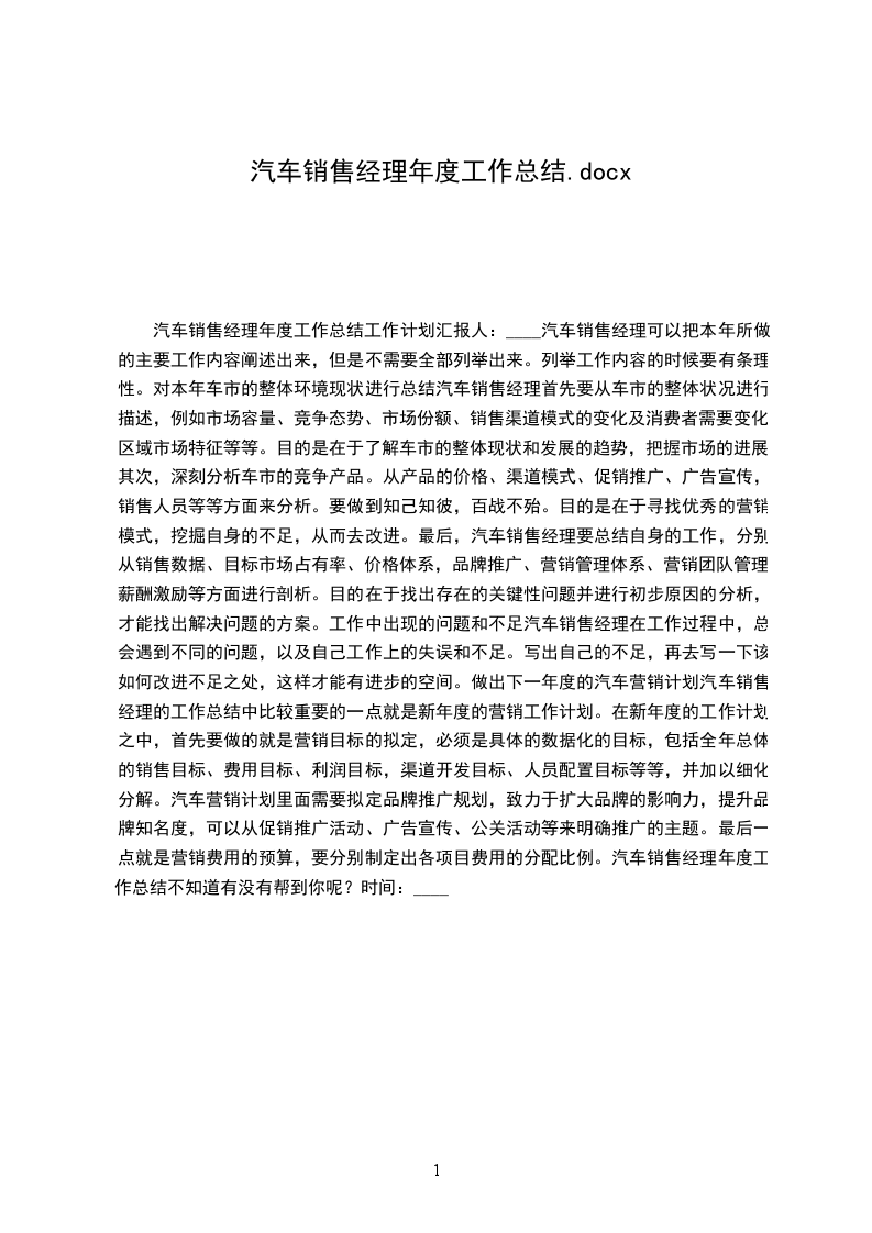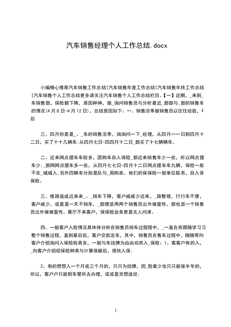 二、做做一下客户回访工作,看一一下保险客户的客源多不多多,如何去开发新的保险客客源,_看到销售上只要有有一个客户看车,销售员就就写一下客户信息,事后,就向其客户购车事宜,保保险客户是否也能留一下客客户信息,打电话询问客户户是否能在我公司保险。以上,是_近期保险工作作的总结,不足之处,请经理指正批评。有望更好好的开展_部的保险业务。汽车销售经理个人工作作总结