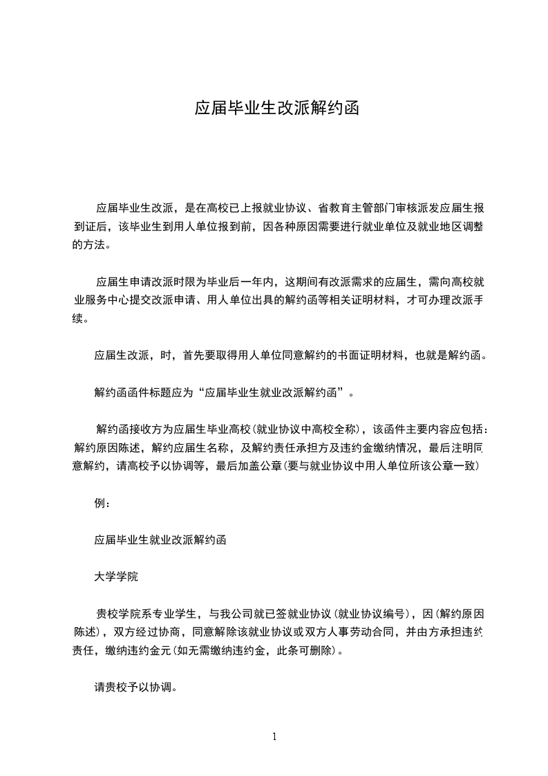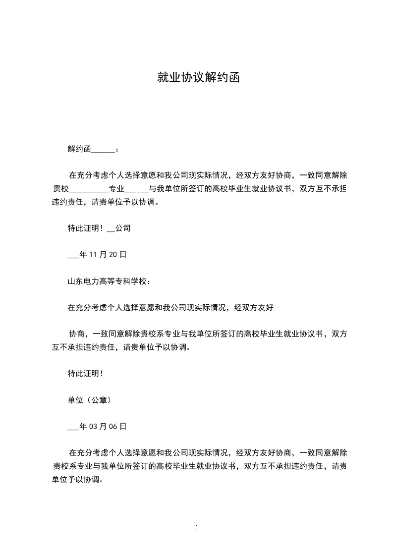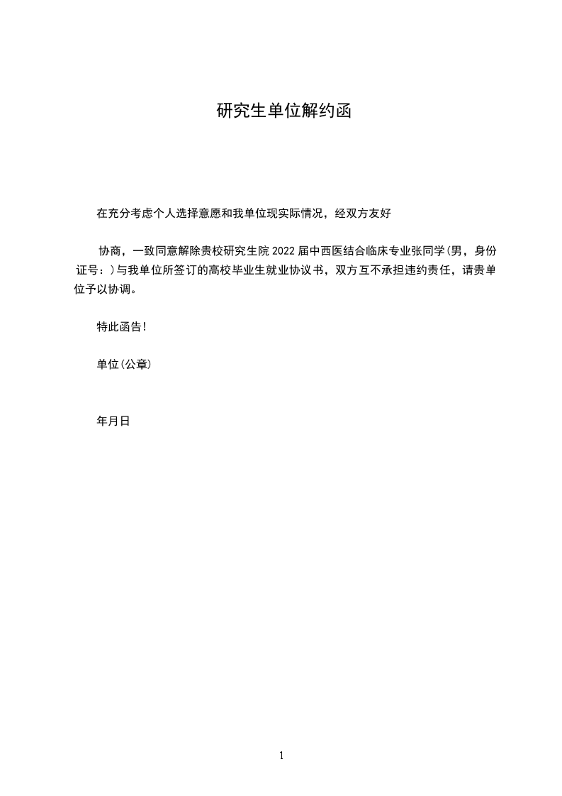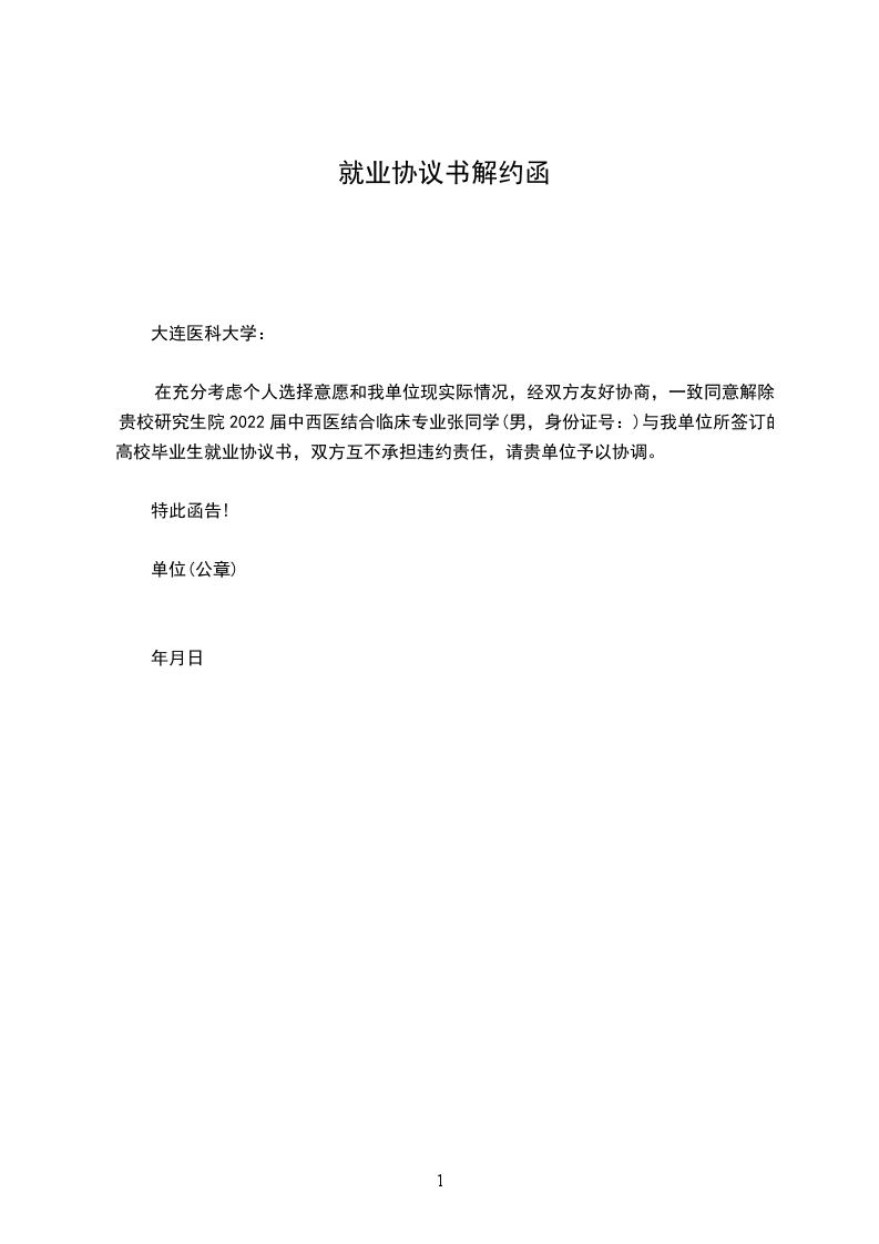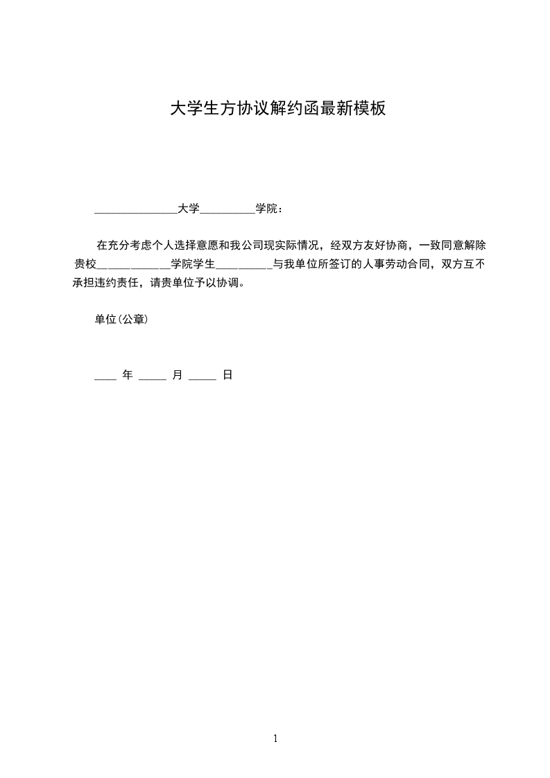 在充分考虑个人选择意愿和我公司现实际情况,经双方友好协商,一致同意解除贵校_____________学院学生__________与我单位所签订的人事劳动合同,双方互不承担违约责任,请贵单位予以协调。