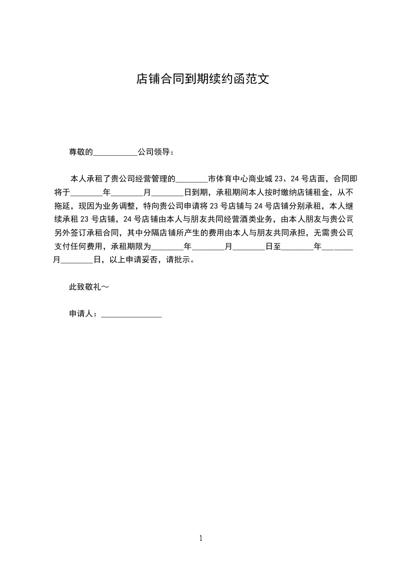 本人承租了贵公司经营管理的________市体育中心商业城23、24号店面,合同即将于________年________月________日到期,承租期间本人按时缴纳店铺租金,从不拖延,现因为业务调整,特向贵公司申请将23号店铺与24号店铺分别承租,本人继续承租23号店铺,24号店铺由本人与朋友共同经营酒类业务,由本人朋友与贵公司另外签订承租合同,其中分隔店铺所产生的费用由本人与朋友共同承担,无需贵公司支付任何费用,承租期限为________年________月________日至________年________月________日,以上申请妥否,请批示。