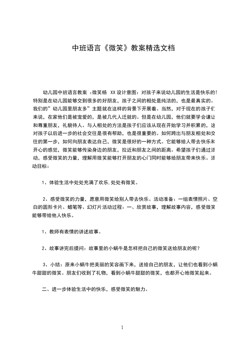 四、跳邀舞歌声与微笑,引导幼儿体用微笑传递快。【故事】小:“我愿意为朋友唱歌,他们高。”大象:“我愿意为朋友干活,他们高。”小X:“我愿意为朋友送信,他们高。”小牛好着急,他能为朋友做什么呢?一天,一群小蚂蚁正忙着搬西,他从小牛身走过时,小蜗牛向他们友好地微笑。小蜗牛想:对呀,我可以把微笑送给朋友们,他高呀!小蜗牛就画了好多张图片,上面一只小蜗牛在甜甜地微笑。朋友看到这张图片,也高地笑了。活目: