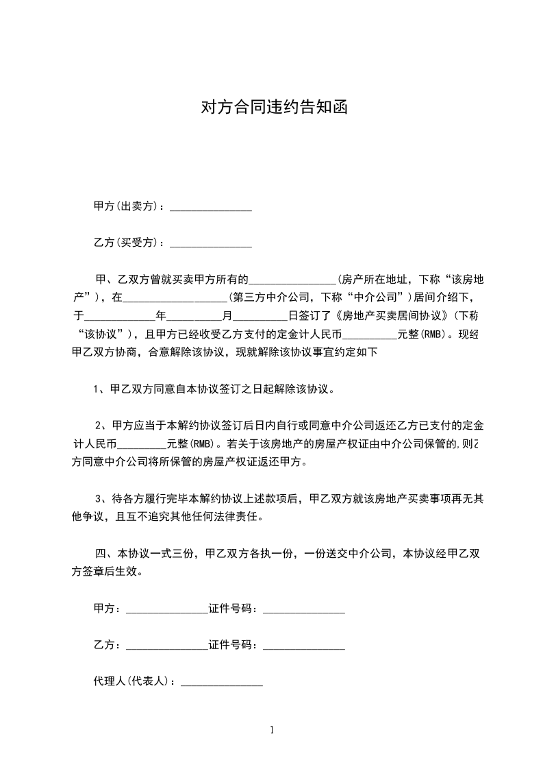 甲、乙双方曾就买卖甲方所有的________________(房产所在地址,下称“该房地产”),在___________________(第三方中介公司,下称“中介公司”)居间介绍下,于_____________年__________月__________日签订了《房地产买卖居间协议》(下称“该协议”),且甲方已经收受乙方支付的定金计人民币__________元整(RMB)。现经甲乙双方协商,合意解除该协议,现就解除该协议事宜约定如下