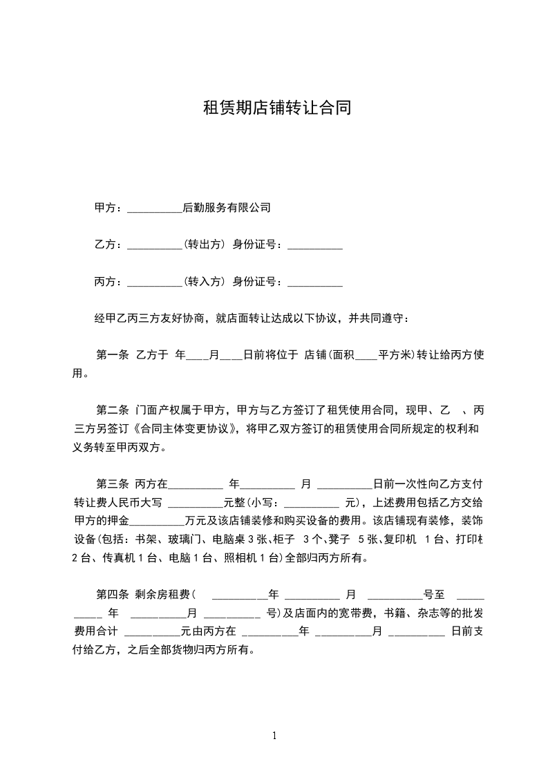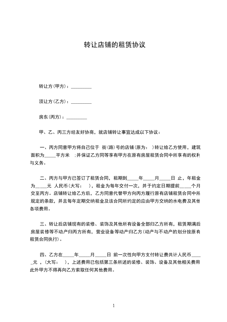 二、租期为三年,________年________月________日至________年________月________日止,乙方一次性支付甲方租金为________万元人民币(大写:________万元)。店铺转让给乙方后,乙方同意代替甲方向房东履行原有店铺租赁合同中所规定的条款,并且每年定期交纳该合同所约定的应由甲方交纳的水电费及其他各项费用。