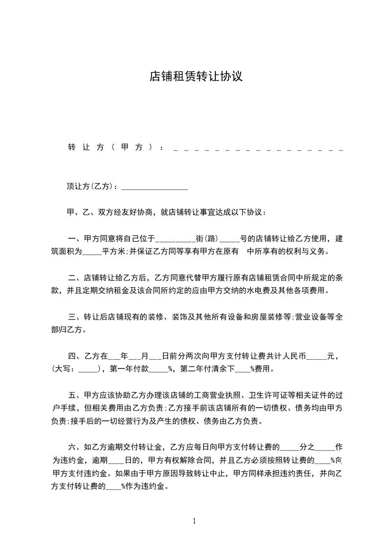 甲、乙双方经友好协商,就店铺转让事宜达成以下协议: