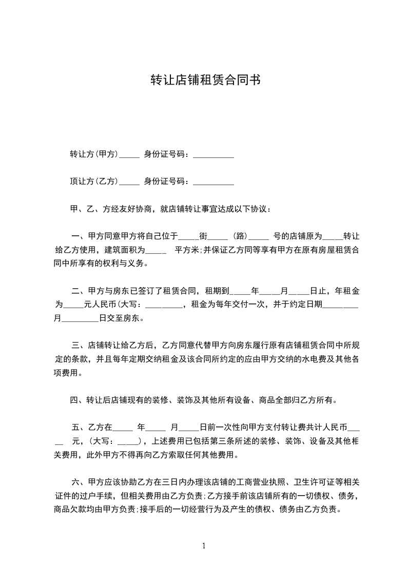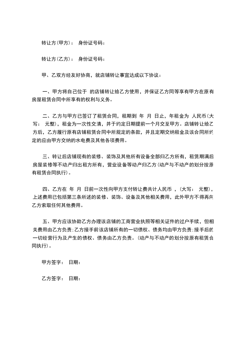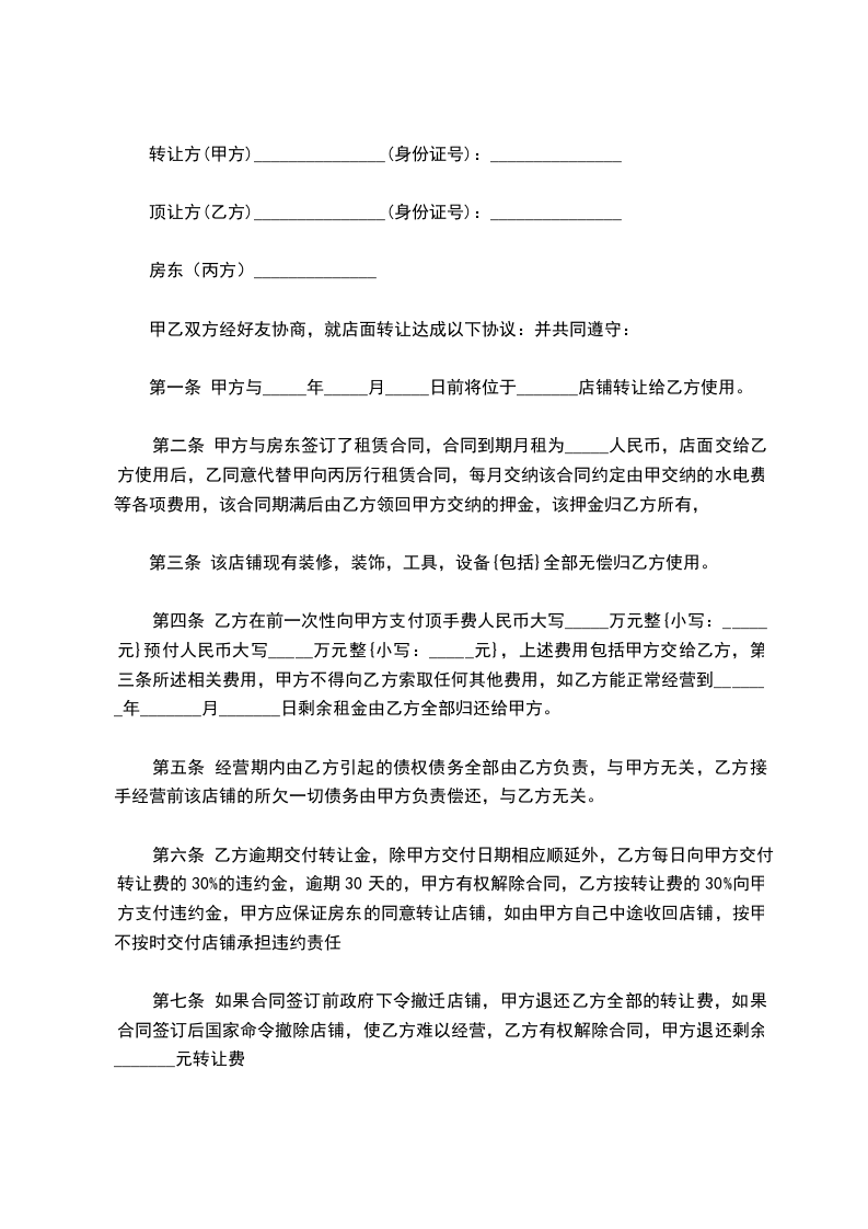 顶让方(乙方):_________________身份证号码:_________________